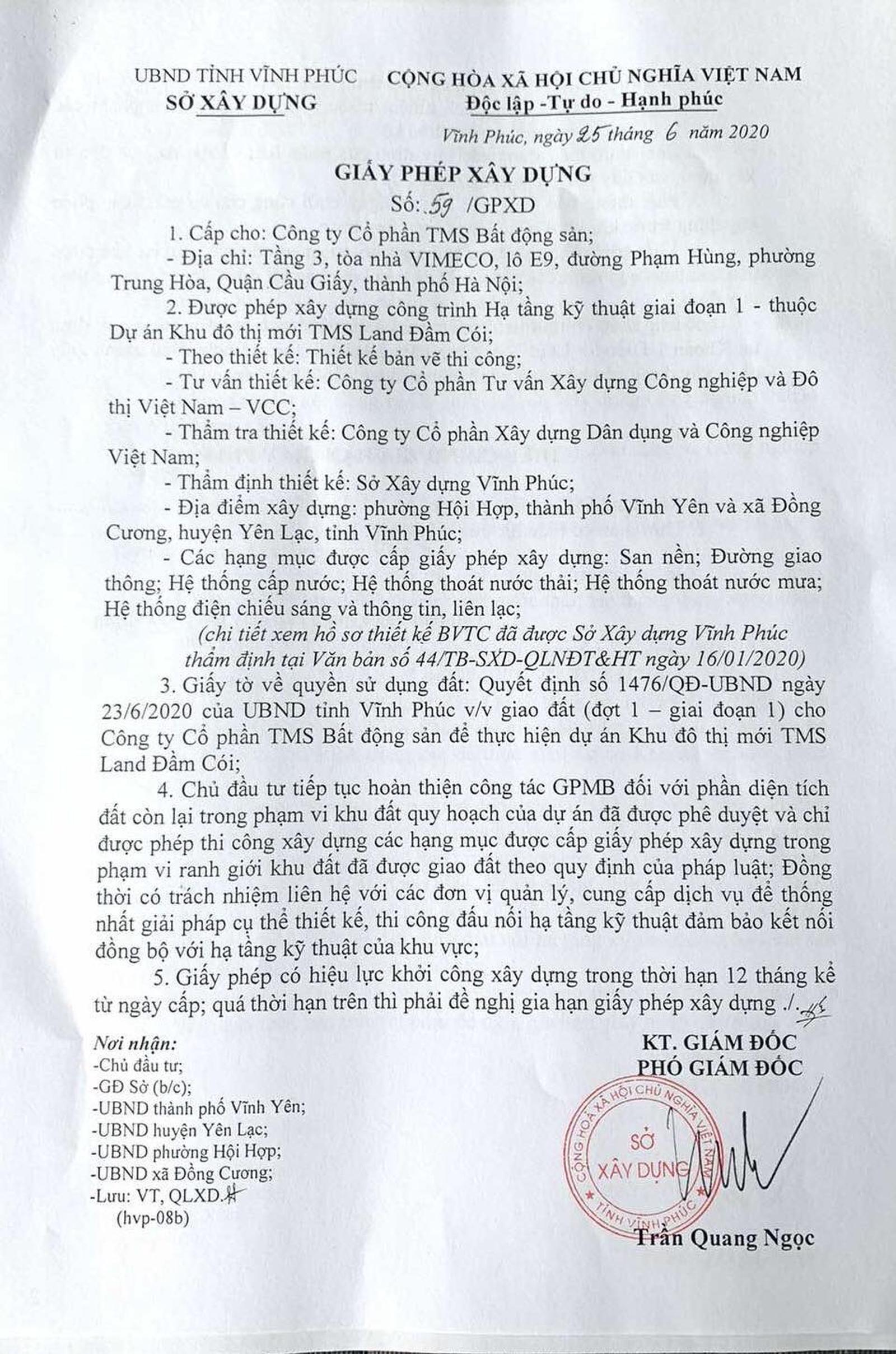 Tiếp đó, ngày 25/6/2020, Sở Xây dựng tỉnh Vĩnh Phúc cấp Giấy phép xây dựng số 59 với các hạng mục được cấp phép xây dựng: San nền; đường giao thông; hệ thống cấp, thoát nước thải, nước mưa; hệ thống điện chiếu sáng và thông tin liên lạc cho Công ty Cổ phần TMS Bất động sản.