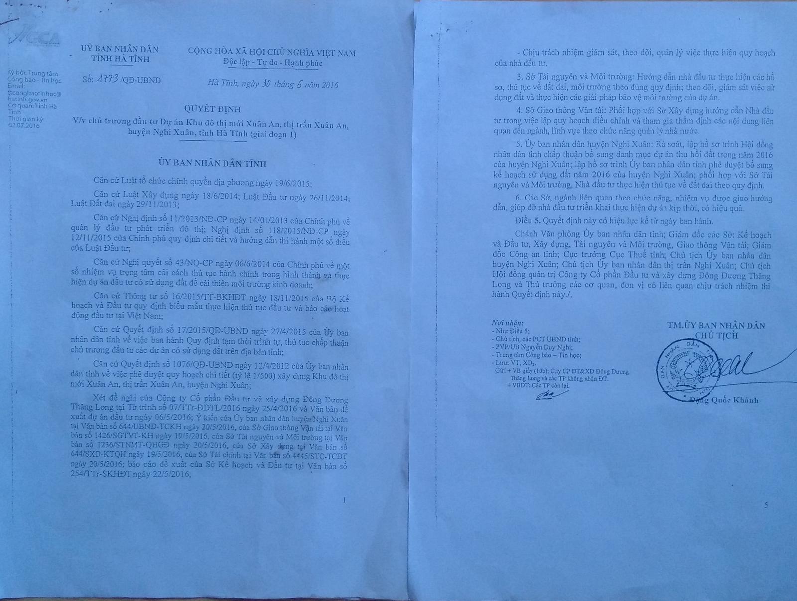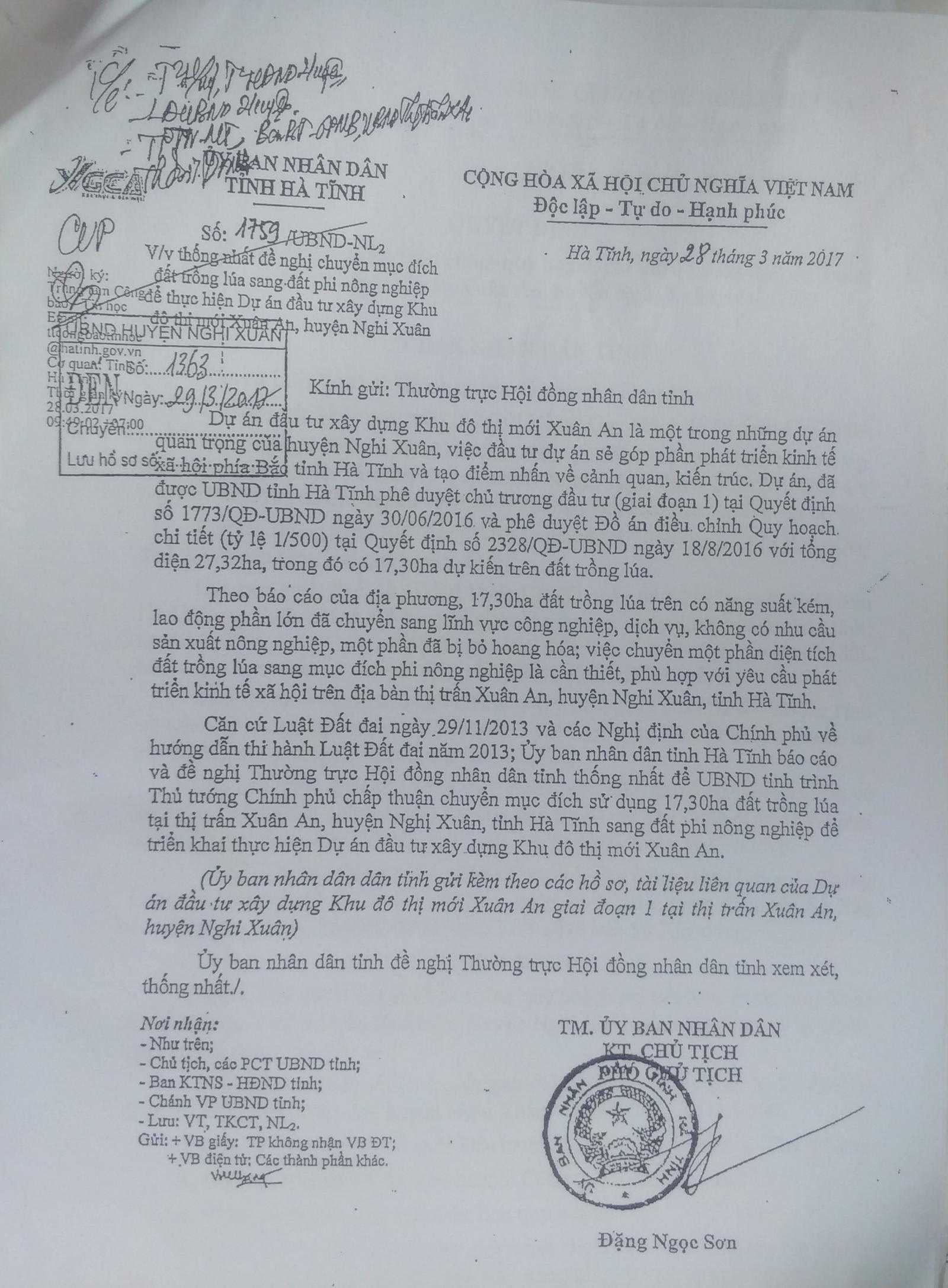 Thế nhưng, đến ngày 28/3/2017, UBND tỉnh Hà Tĩnh mới có Công văn số 1759/UBND-NL2 gửi Thường trực Hội đồng nhân dân tỉnh về việc đề nghị thống nhất để UBND tỉnh trình Thủ tướng Chính phủ xin chấp thuận chuyển mục đích sử dụng 17,3 ha đất trồng lúa tại thị trấn Xuân An, huyện Nghi Xuân sang đất phi nông nghiệp để triển khai thực hiện Dự án đầu tư xây dựng Khu đô thị mới Xuân An.
