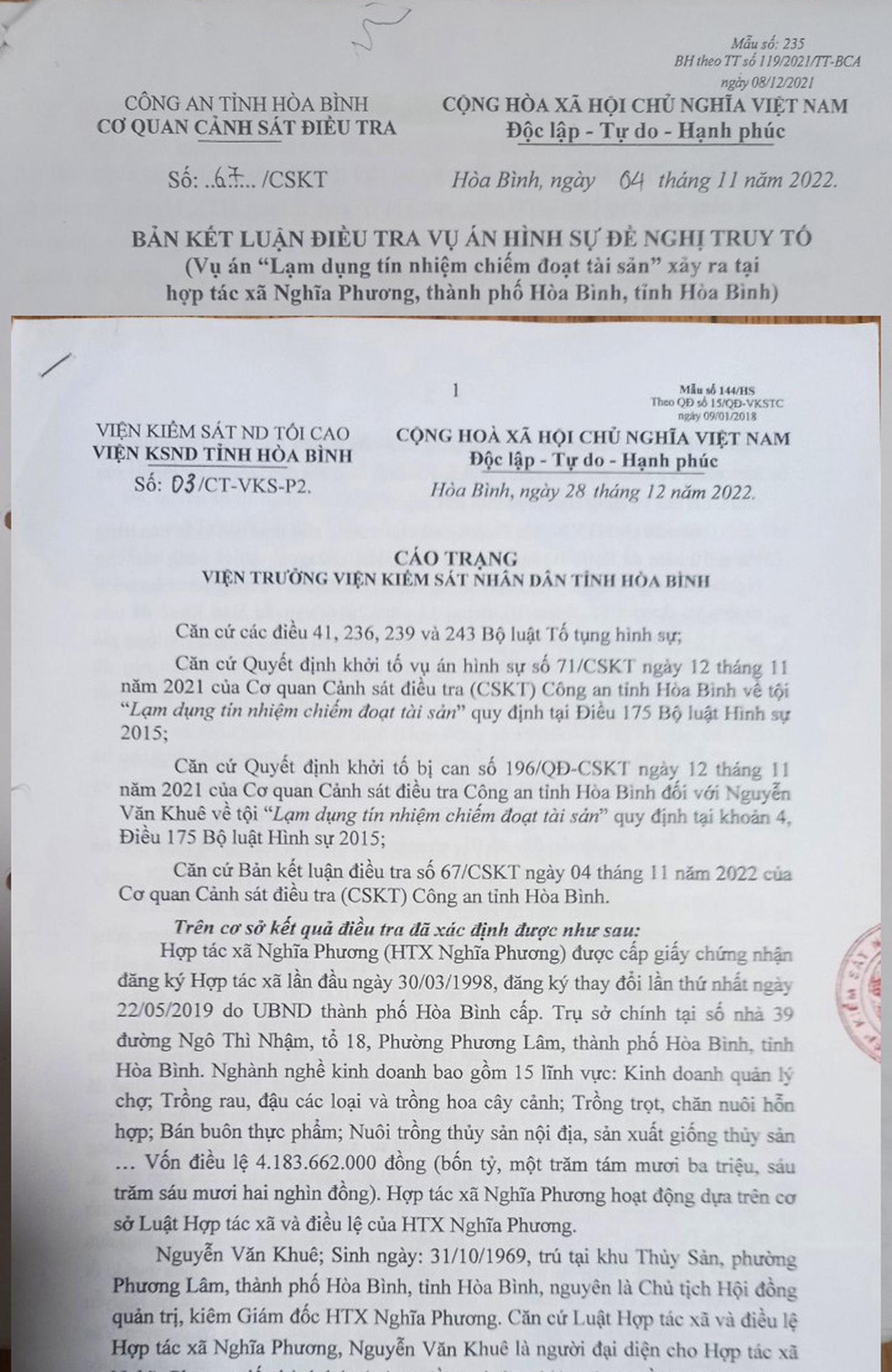 Theo kết luận điều tra vụ án hình sự “lạm dụng tín nhiệm chiếm đoạt tài sản” xảy ra tại Hợp tác xã (HTX) Nghĩa Phương, thành phố Hòa Bình, tỉnh Hòa Bình của Cơ quan Cảnh sát Điều tra (CSĐT), Công an tỉnh Hòa Bình, vụ án được miêu tả như sau:
