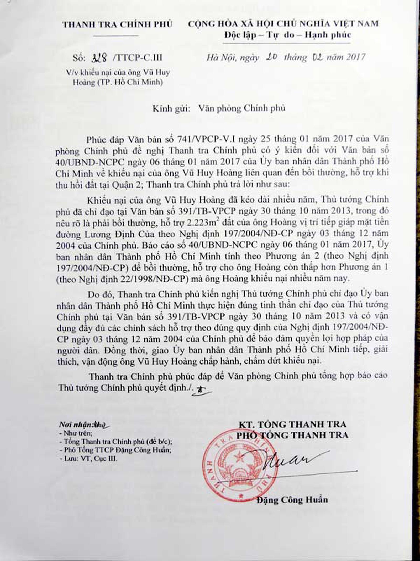 Sau 4 lần kiểm tra, thanh tra, xác minh làm rõ, Thanh tra Chính phủ và nhiều bộ, ngành đều thống nhất kết luận là: Nội dung khiếu nại của ông Vũ Huy Hoàng (số 139 đường Nguyễn Thông, quận 3) về quyền sử dụng 2.223m2 đất là có cơ sở. Qua kiểm tra hiện trạng sử dụng đất, đối chiếu với lịch sử nhà đất tại phường An Khánh, quận 2, Thanh tra Chính phủ đã kiến nghị Thủ tướng Chính phủ chỉ đạo Chủ tịch UBND TP Hồ Chí Minh giải quyết khiếu nại của ông Hoàng theo hướng bồi thường quyền sử dụng 2.223m2 đất có vị trí mặt tiền đường Lương Định Của, đúng quy định tại Nghị định số 84/2007/NĐ-CP, Nghị định số 197/2004/NĐ-CP.