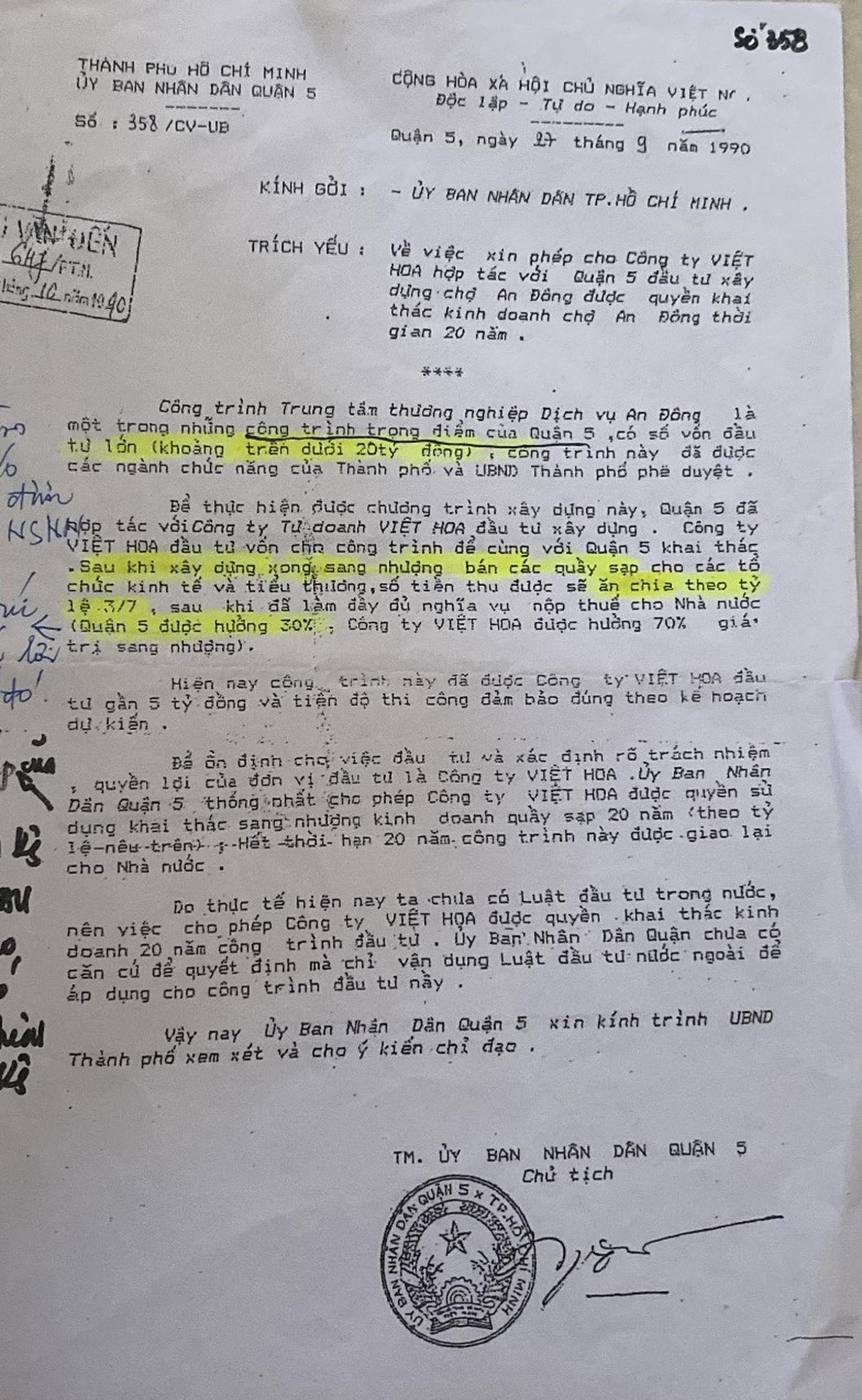 Công văn của UBND quận 5 thể hiện chợ được đầu tư dưới hình thức tư nhân góp vốn thì được quyền sử dụng, khai thác, sang nhượng, kinh doanh quầy sạp. Ảnh: Ngân Nga