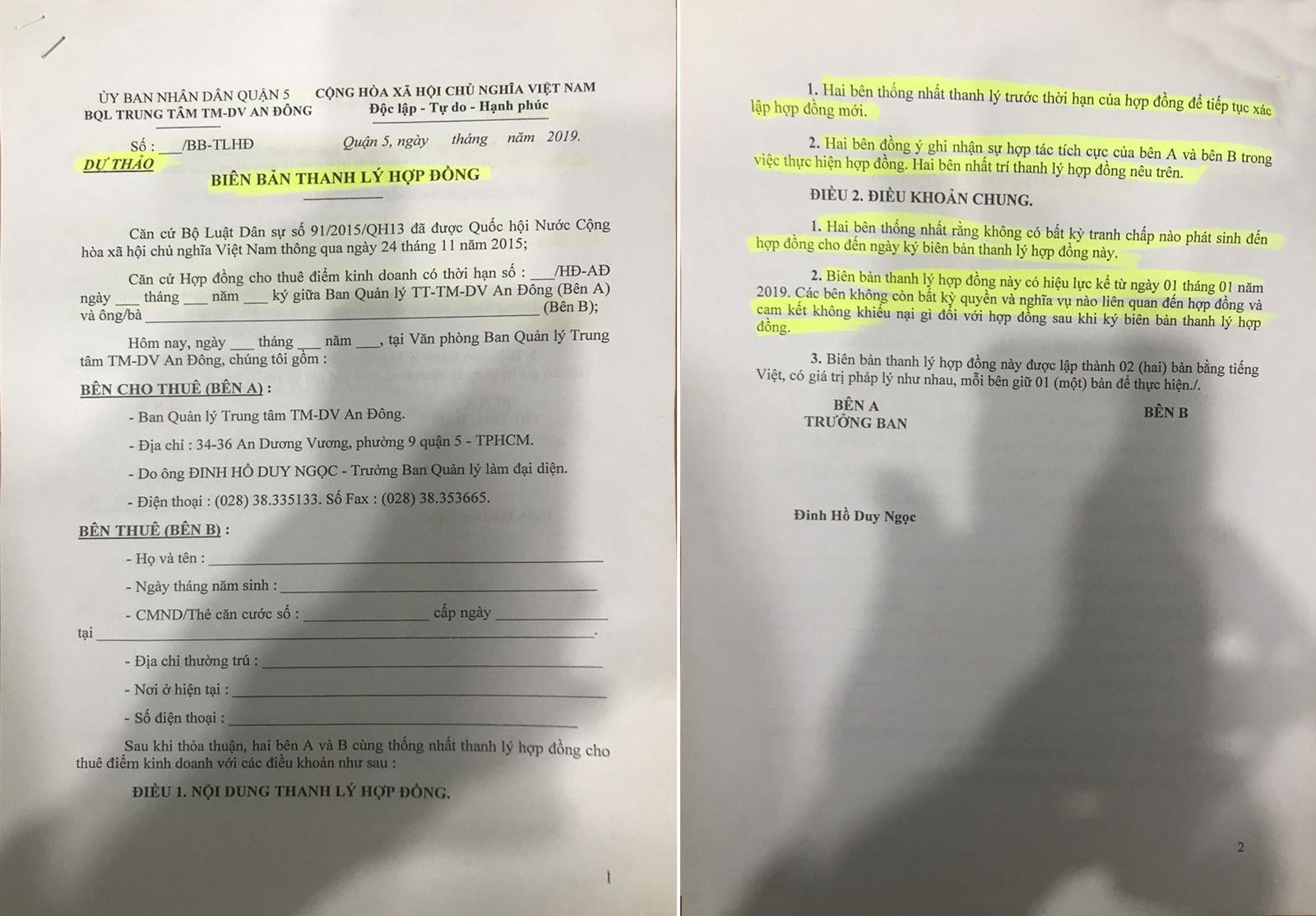 Mặc dù hợp đồng thuê điểm kinh doanh đang còn hiệu lực nhưng ngày 7/6/2019, Ban Quản lý TTTMDV An Đông gửi thư mời kèm 3 bản dự thảo: Biên bản thanh lý hợp đồng; biên bản thỏa thuận về thực hiện nghĩa vụ tài chính theo hợp đồng và dự thảo hợp đồng sử dụng điểm kinh doanh.