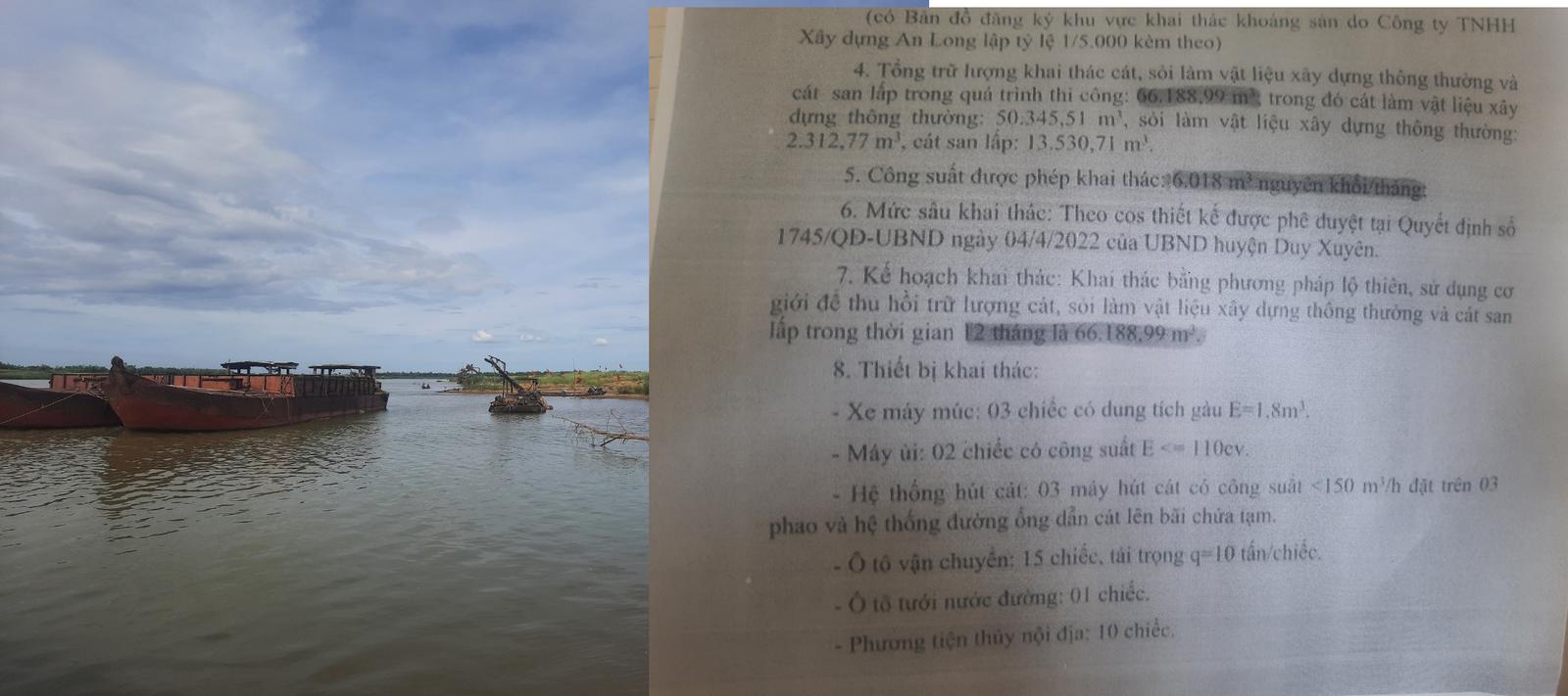 Theo hồ sơ, để thực hiện việc vận chuyển khối lượng nạo vét, đồng thời tính toán hợp lý việc tận thu cát, sỏi trong quá trình nạo vét nhằm tạo nguồn kinh phí thực hiện dự án, UBND huyện Duy Xuyên ban hành Quyết định số 383/QĐ-UBND ngày 12/1/2022, Quyết định số 1745/QĐ-UBND ngày 4/4/2022 cho phép Công ty An Long thực hiện thu hồi cát, sỏi làm vật liệu xây dựng trong quá trình nạo vét bồi lấp kênh dẫn trạm bơm Cù Bàn.