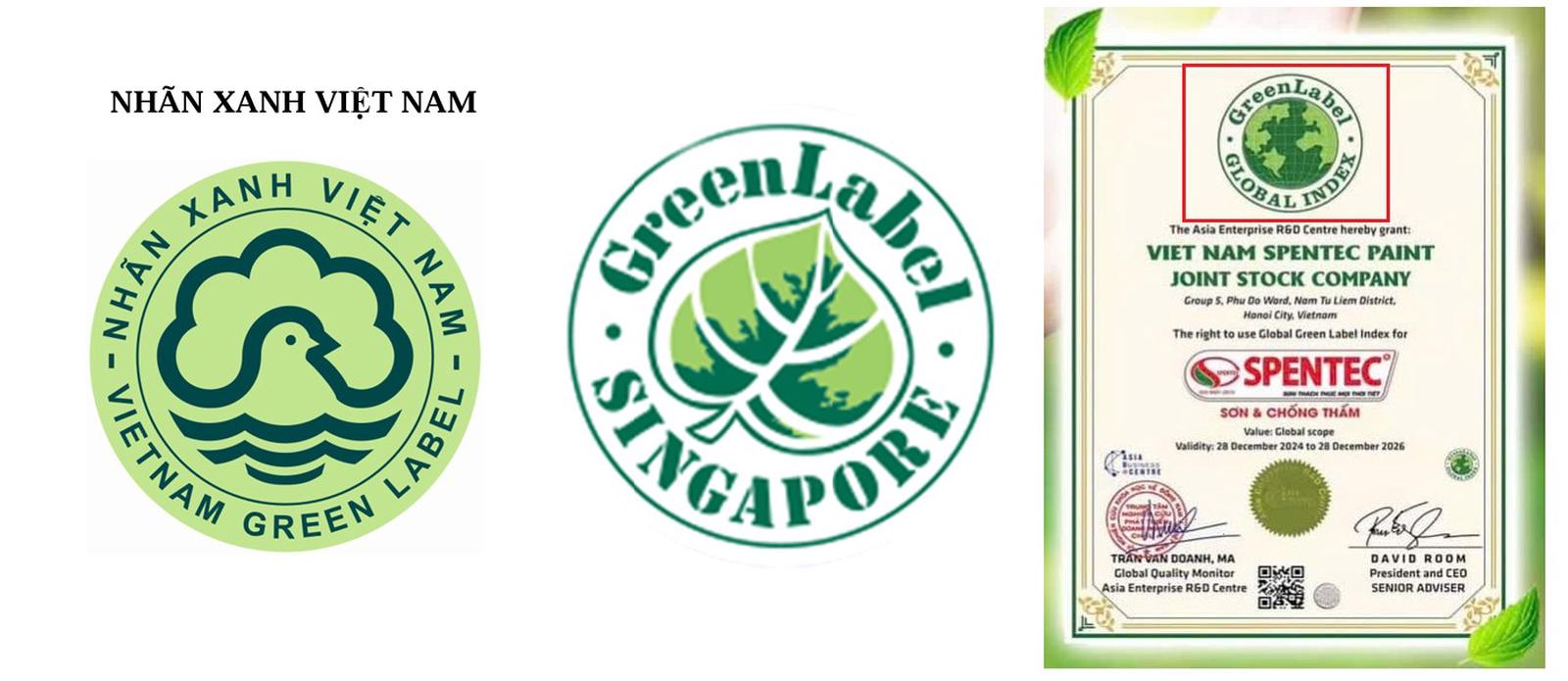 Từ trái qua phải: Nhãn xanh Việt Nam – Nhãn xanh Singapore - Chỉ số Nhãn Xanh Toàn Cầu - Global Green Label Index do Trung tâm Nghiên cứu Phát triển Doanh nghiệp Châu Á cấp.