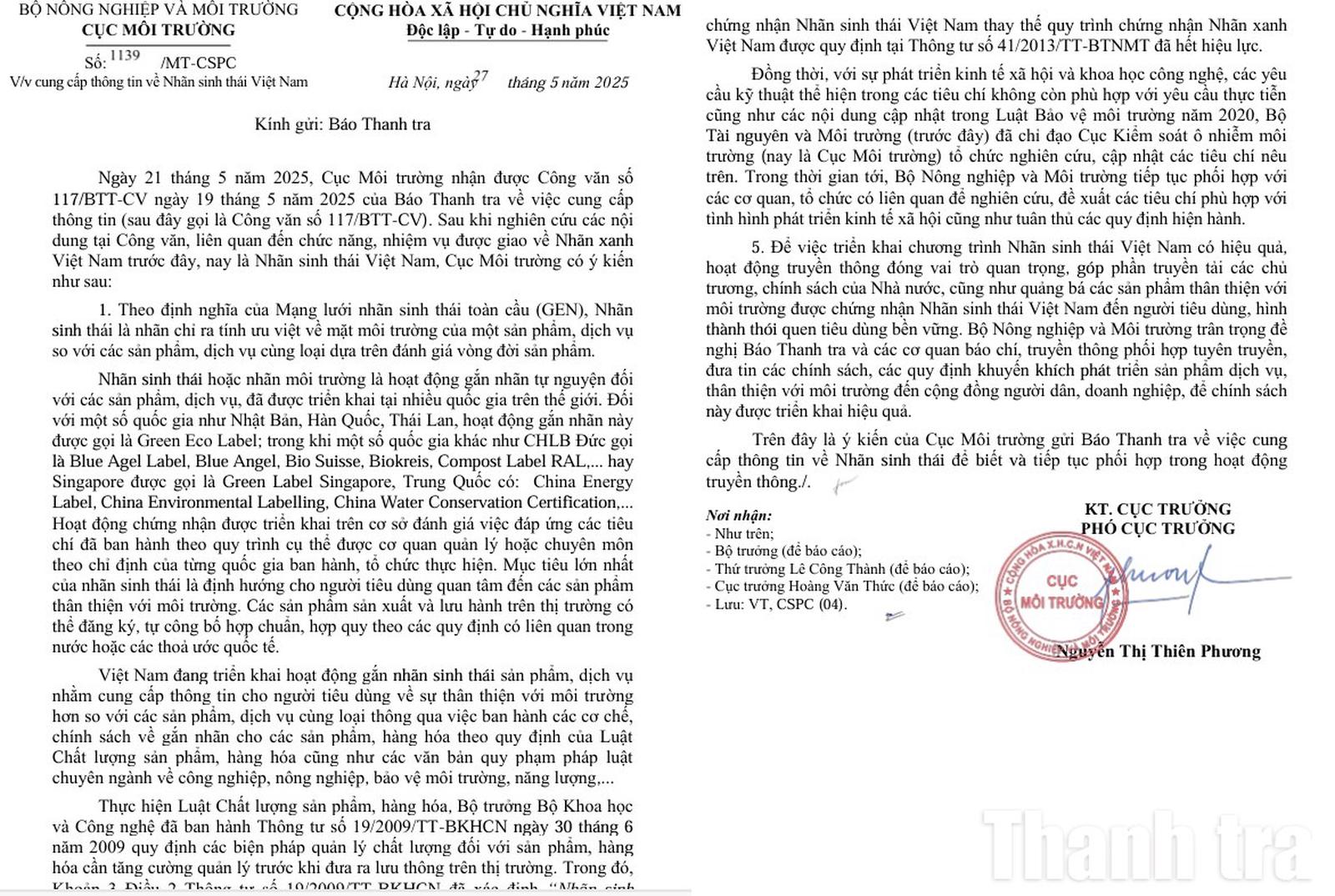 Ngày 27/05/2025, Cục Môi trường (Bộ Nông nghiệp và Môi trường) đã có Công văn số 1139/MT-CSPC trả lời Báo Thanh tra về việc cung cấp thông tin về Nhãn sinh thái Việt Nam (hay còn gọi là nhãn xanh, nhãn môi trường).