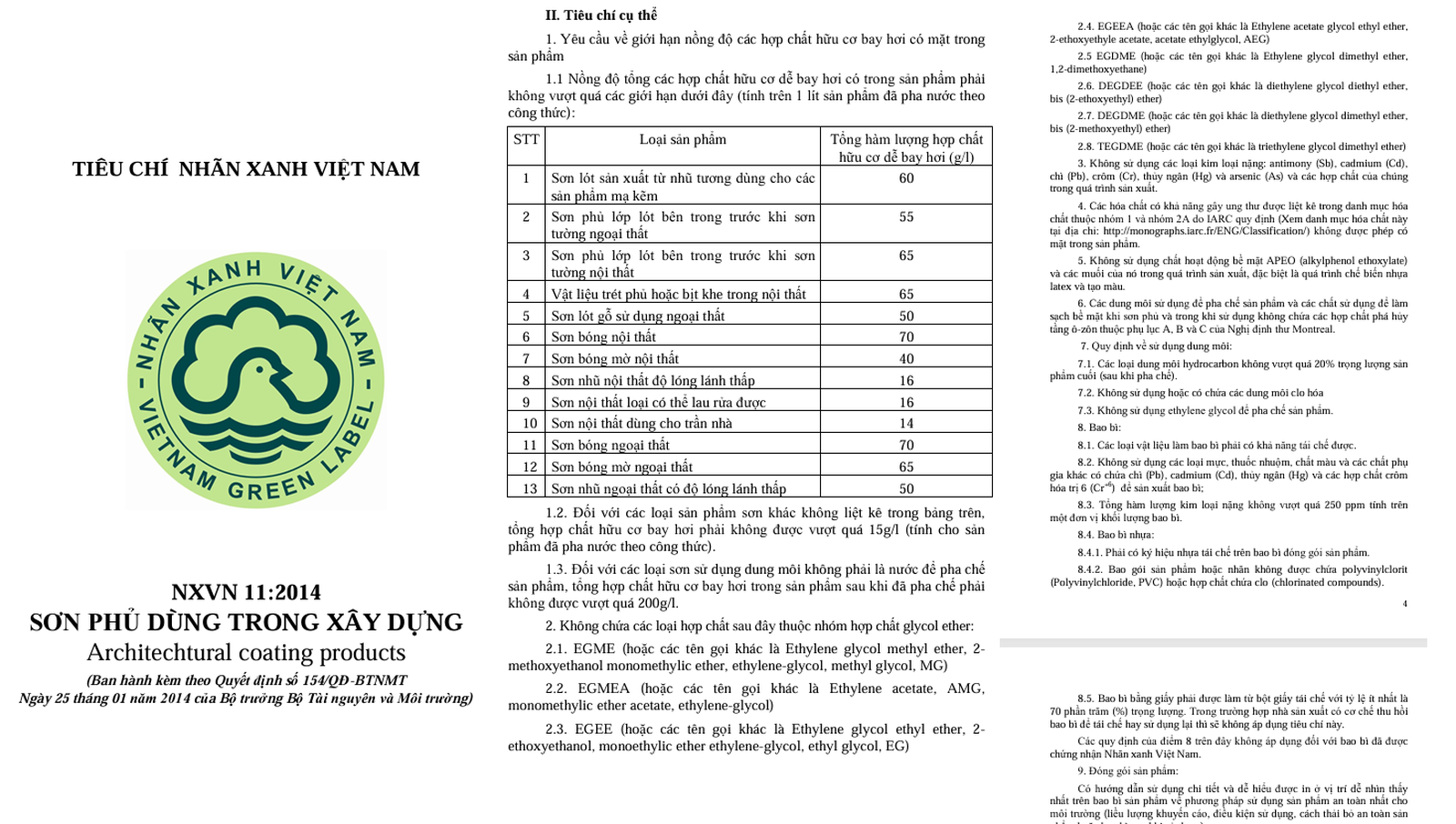 Tuy nhiên, phải đến năm 2014, Bộ Tài nguyên và Môi trường mới ban hành Quyết định số 154/QĐ-BTNMT ngày 25/01/2014, Quyết định số 2186/QĐ-BTNMT ngày 19/11/2017 công bố các tiêu chí làm căn cứ để chứng nhận Nhãn xanh Việt Nam đối với 17 loại sản phẩm thân thiện với môi trường. Trong đó, đáng chú ý bao gồm tiêu chí NXVN 11:2014 cho sản phẩm Sơn phủ dùng trong xây dựng.