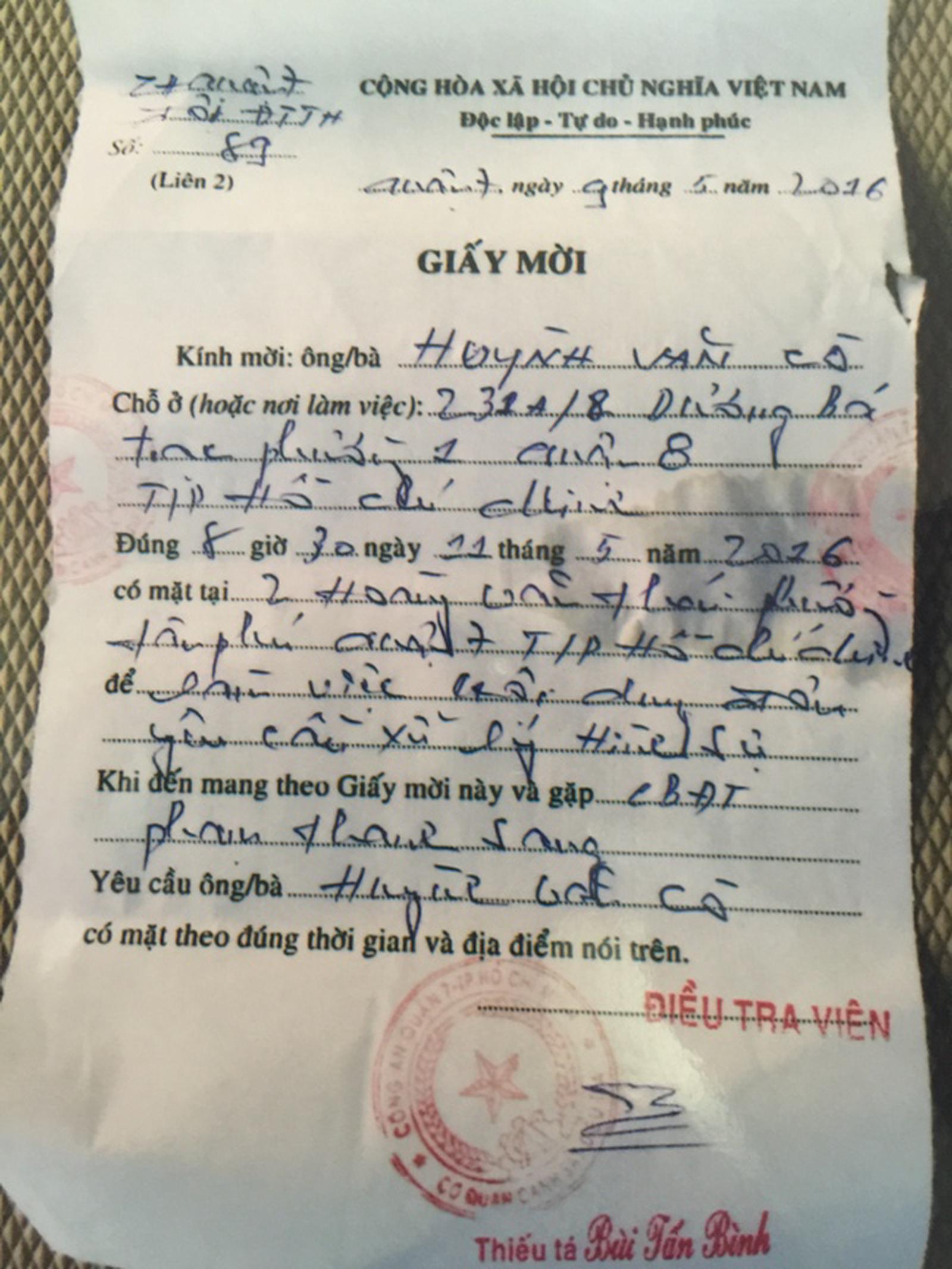Công an quận 7 còn ký giấy mời ông Cò lên làm việc với lý do ông Thống có đơn yêu cầu xử lý hình sự (?). Ảnh: NG