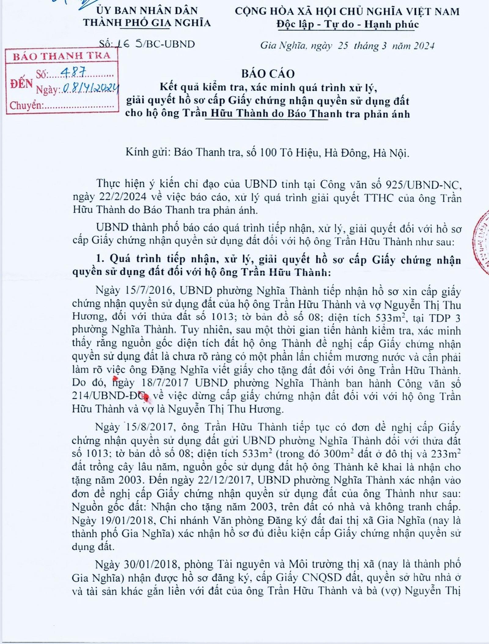 Báo cáo 163 của UBND TP Gia Nghĩa thể hiện, hộ ông Trần Hữu Thành và vợ Nguyễn Thị Thu Hương được UBND phường Nghĩa Thành (nay thuộc TP Gia Nghĩa) tiếp nhận hồ sơ xin cấp giấy chứng nhận quyền sử dụng đất (GCNQSDĐ), quyền sở hữu nhà ở và tài sản khác gắn liền với đất (gọi chung là sổ đỏ) đối với thửa đất số 1013, tờ bản đồ số 08, từ ngày 15/7/2016.
