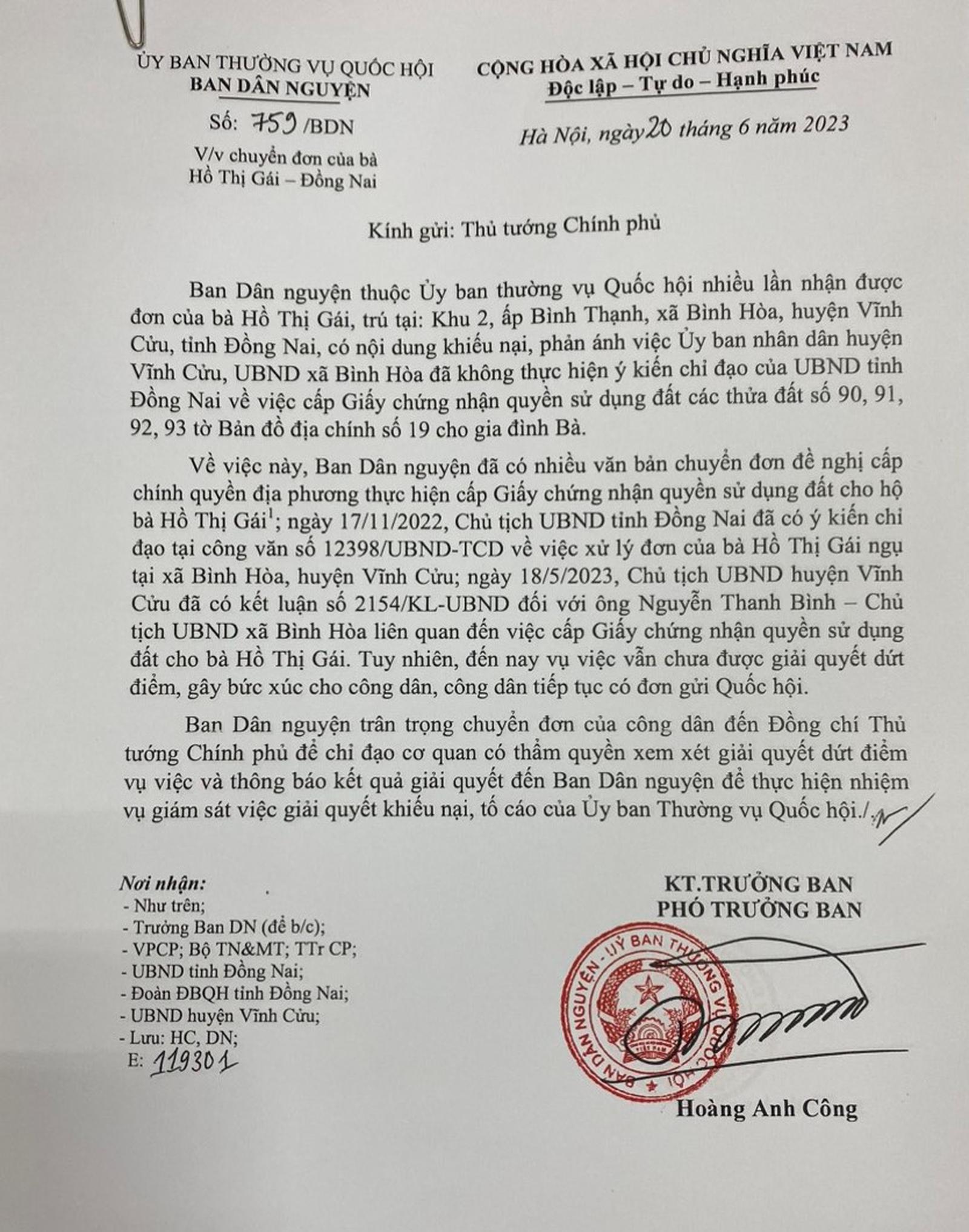 Nội dung văn bản thể hiện: “Ban Dân nguyện thuộc Ủy ban Thường vụ Quốc hội nhiều lần nhận được đơn của bà Hồ Thị Gái, trú tại: Khu 2, ấp Bình Thạnh, xã Bình Hòa, huyện Vĩnh Cửu, tỉnh Đồng Nai, có nội dung khiếu nại, phản ánh việc UBND huyện Vĩnh Cửu, UBND xã Bình Hòa đã không thực hiện ý kiến chỉ đạo của UBND tỉnh Đồng Nai về việc cấp giấy chứng nhận quyền sử dụng đất (GCNQSDĐ) các thửa đất số 90, 91, 92, 93 tờ bản đồ địa chính số 19 cho gia đình.