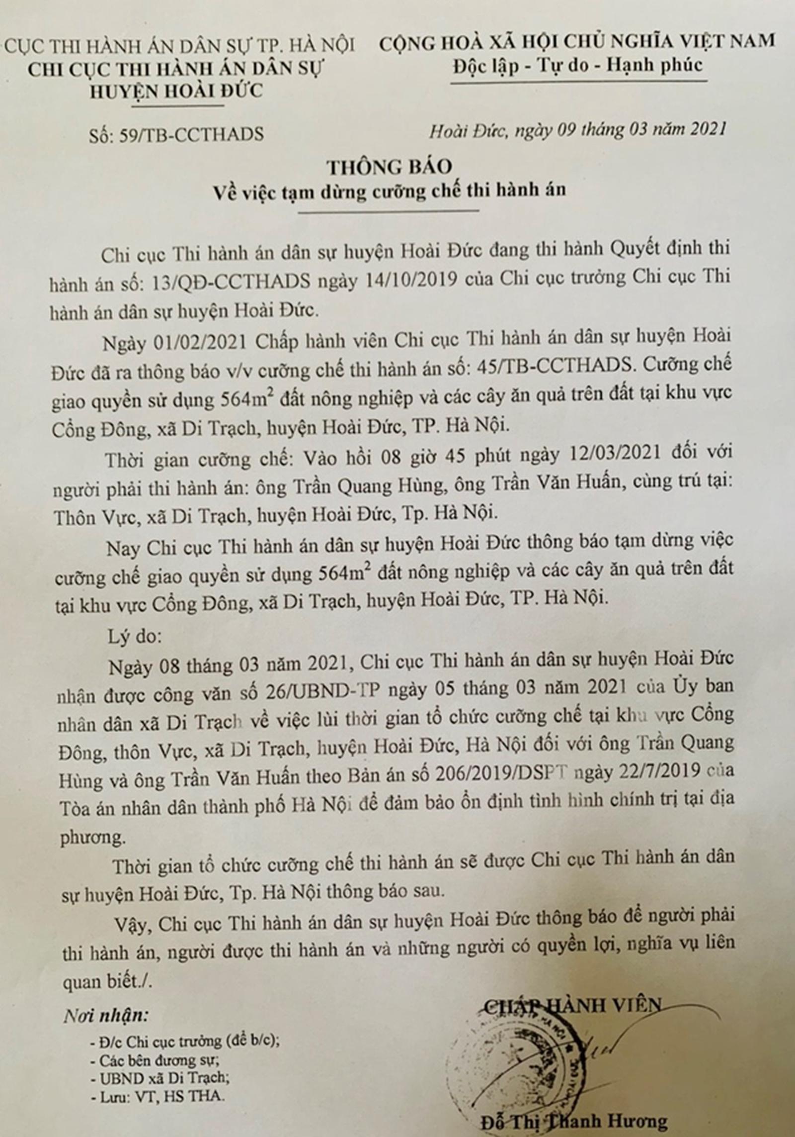 Thế nhưng, ngày 9/3/2021, Chi cục THADS huyện Hoài Đức ban hành Thông báo số 59/TB-CCTHADS về việc tạm dừng cưỡng chế THA với lý do: Ngày 5/3/2021, UBND xã Di Trạch có Văn bản số 26/UBND-TP xin lùi thời gian tổ chức cưỡng chế THA để đảm bảo ổn định tình hình chính trị địa phương.