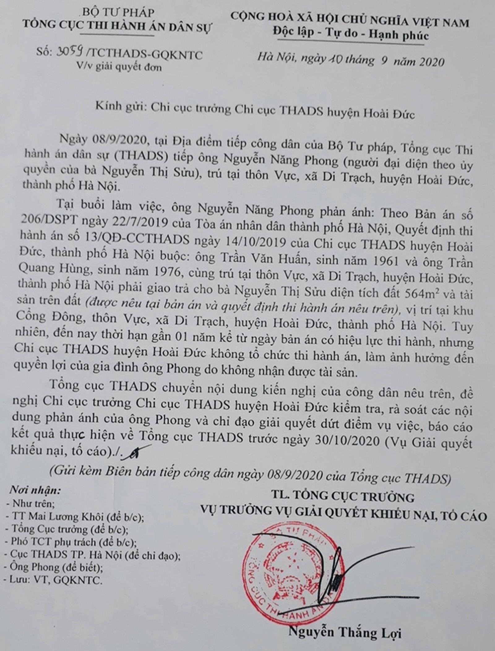 “Để tránh việc khiếu nại, tố cáo vượt cấp, kéo dài, Tổng cục THADS chuyển nội dung trình bày của ông Phong yêu cầu Cục trưởng Cục THADS thành phố Hà Nội kiểm tra nội dung vụ việc, chỉ đạo Chi cục trưởng Chi cục THADS huyện Hoài Đức giải quyết khiếu nại theo thẩm quyền và tổ chức thi hành án theo đúng quy định của pháp luật, trả lời đương sự” - văn bản nêu.