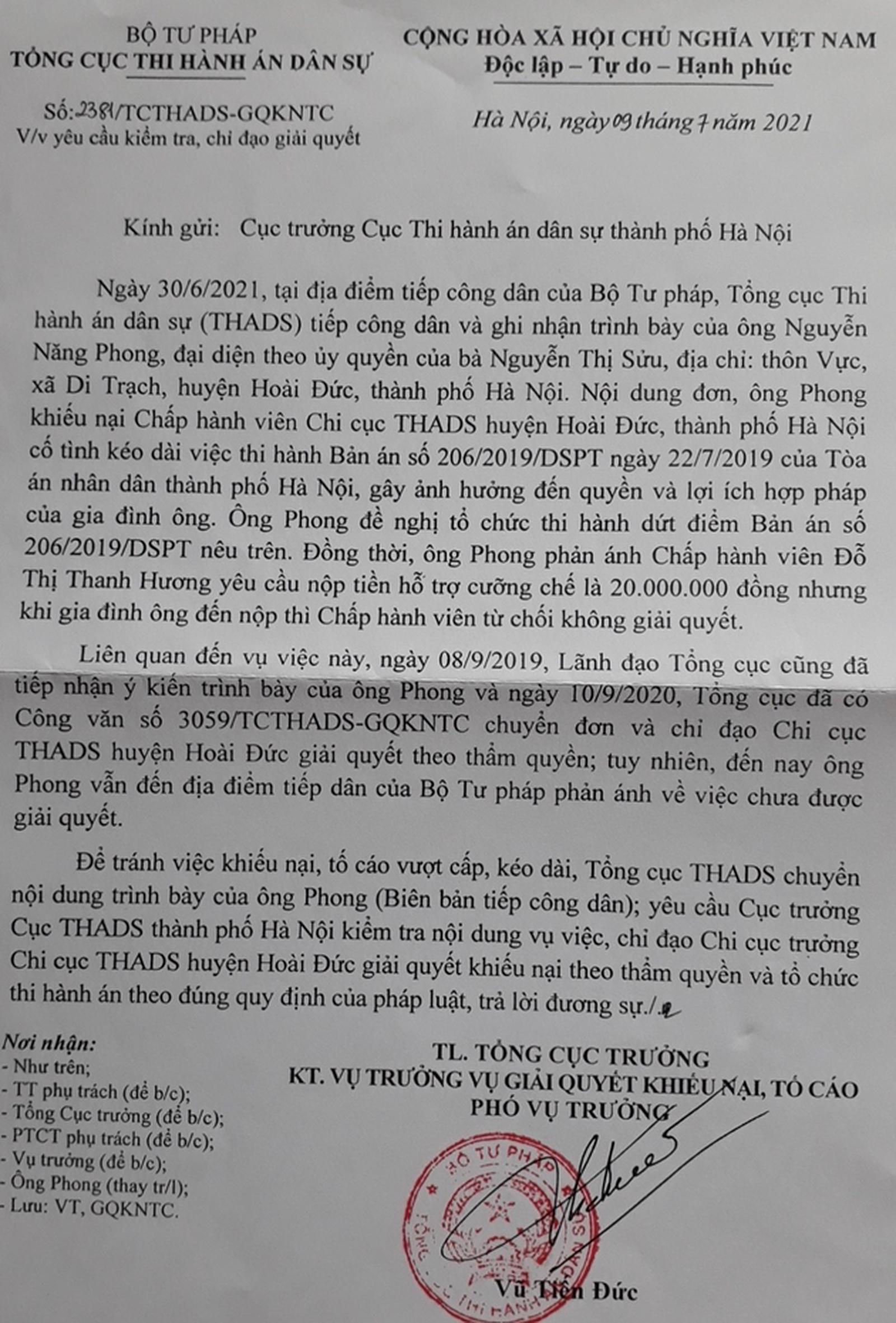 Ngày 9/7/2021, Tổng cục THADS tiếp tục có Văn bản số 2381/TCTHADS-GQKNTC về việc yêu cầu kiểm tra, chỉ đạo giải quyết vụ việc gửi Cục trưởng Cục THADS thành phố Hà Nội. Nội dung văn bản cho thấy, ngày 10/9/2019, Tổng cục THADS đã có Văn bản số 3059/TCTHADS-GQKNTC chuyển đơn và chỉ đạo Chi cục THADS huyện Hoài Đức giải quyết theo thẩm quyền; tuy nhiên, đến nay ông Phong vẫn đến địa điểm tiếp dân của Bộ Tư pháp phản ánh về việc chưa được giải quyết.