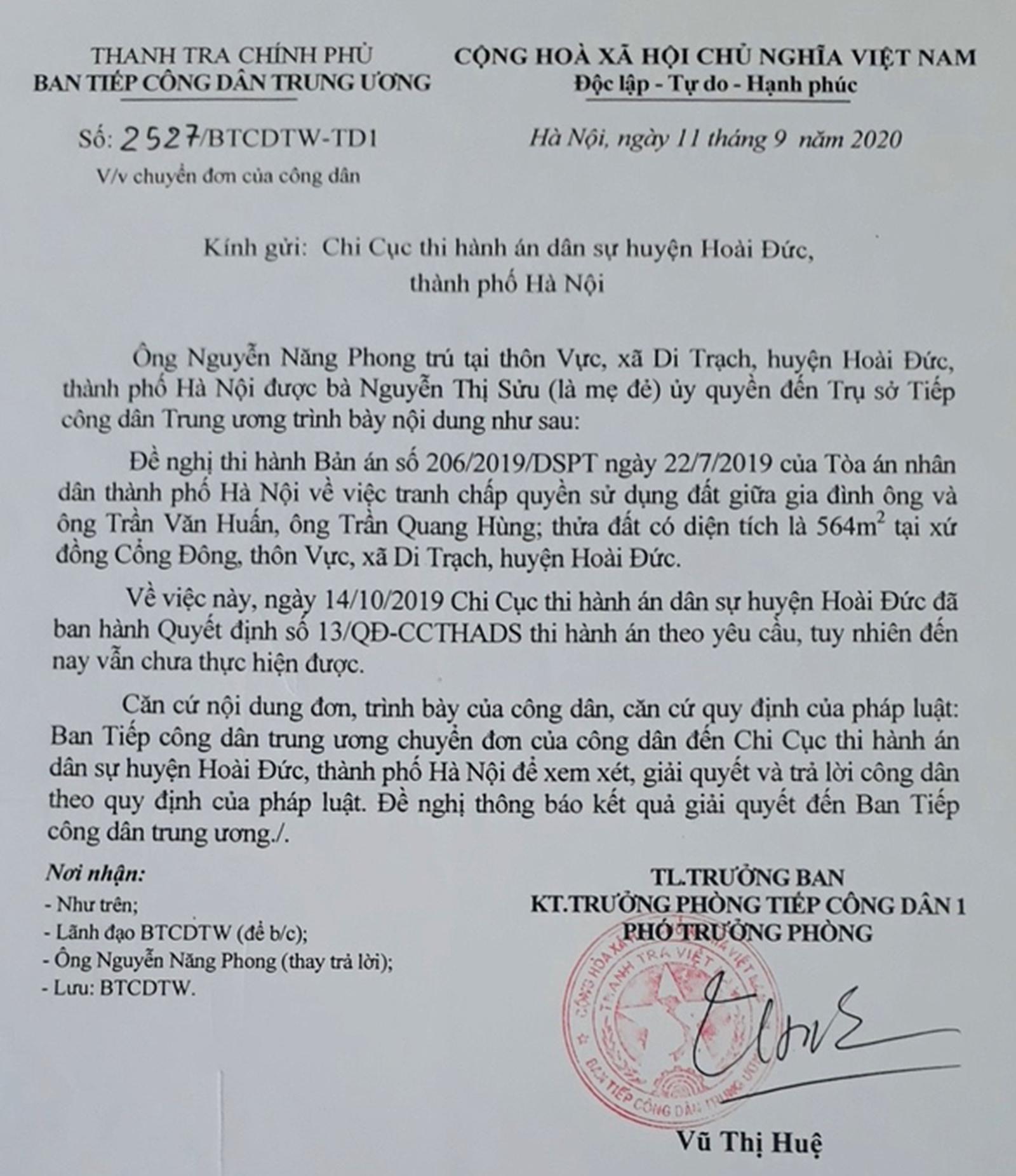 Liên quan đến vụ việc này, ngày 11/9/2020, Ban Tiếp công dân Trung ương có Văn bản số 2527/BTCDTW-TD1 chuyển đơn của công dân Nguyễn Năng Phong đến Chi cục trưởng Chi cục THADS huyện Hoài Đức để xem xét giải quyết và trả lời công dân theo quy định của pháp luật. Đề nghị thông báo kết quả giải quyết đến Ban Tiếp công dân Trung ương. Thế nhưng vụ việc vẫn không có tiến triển.