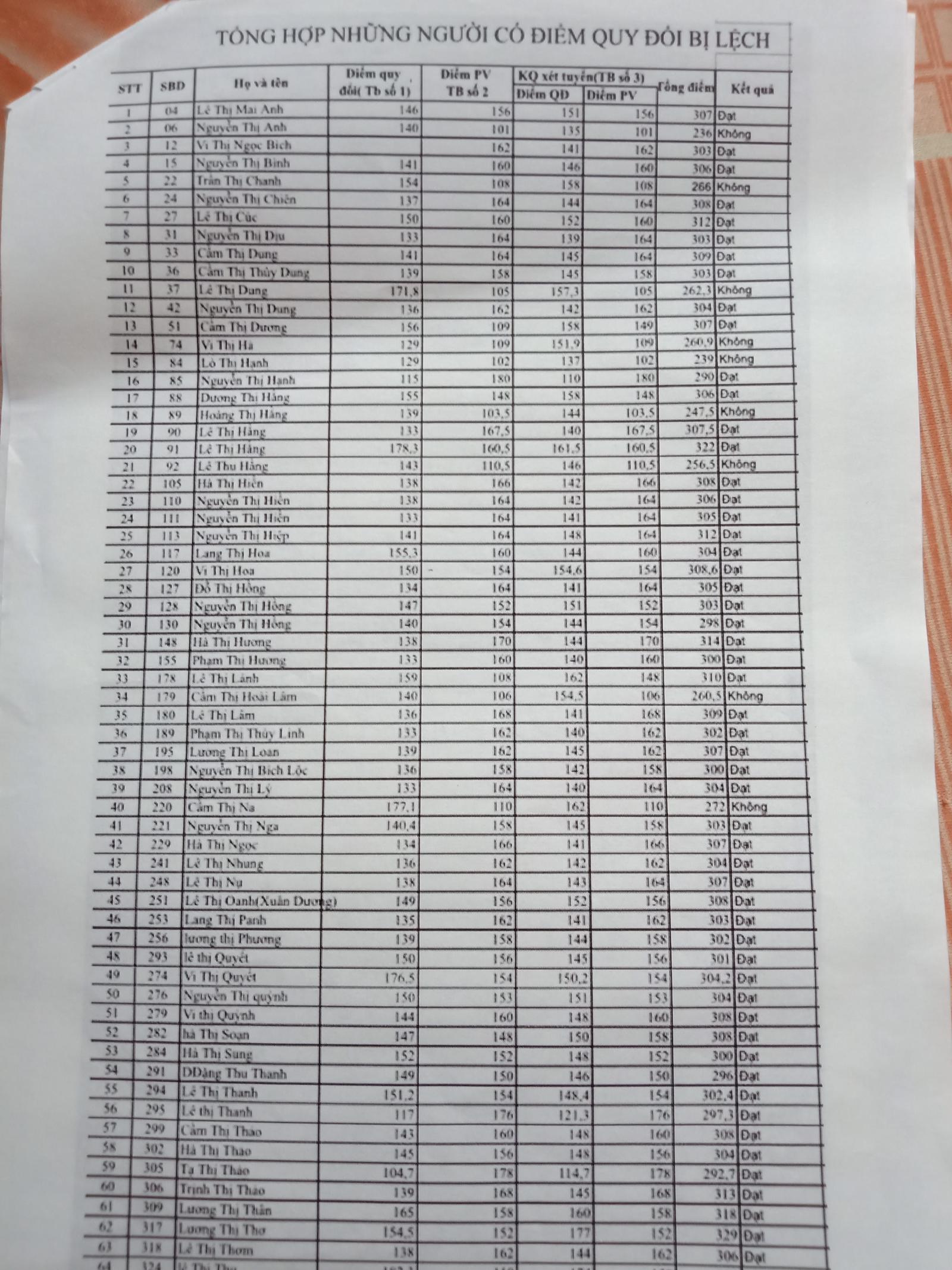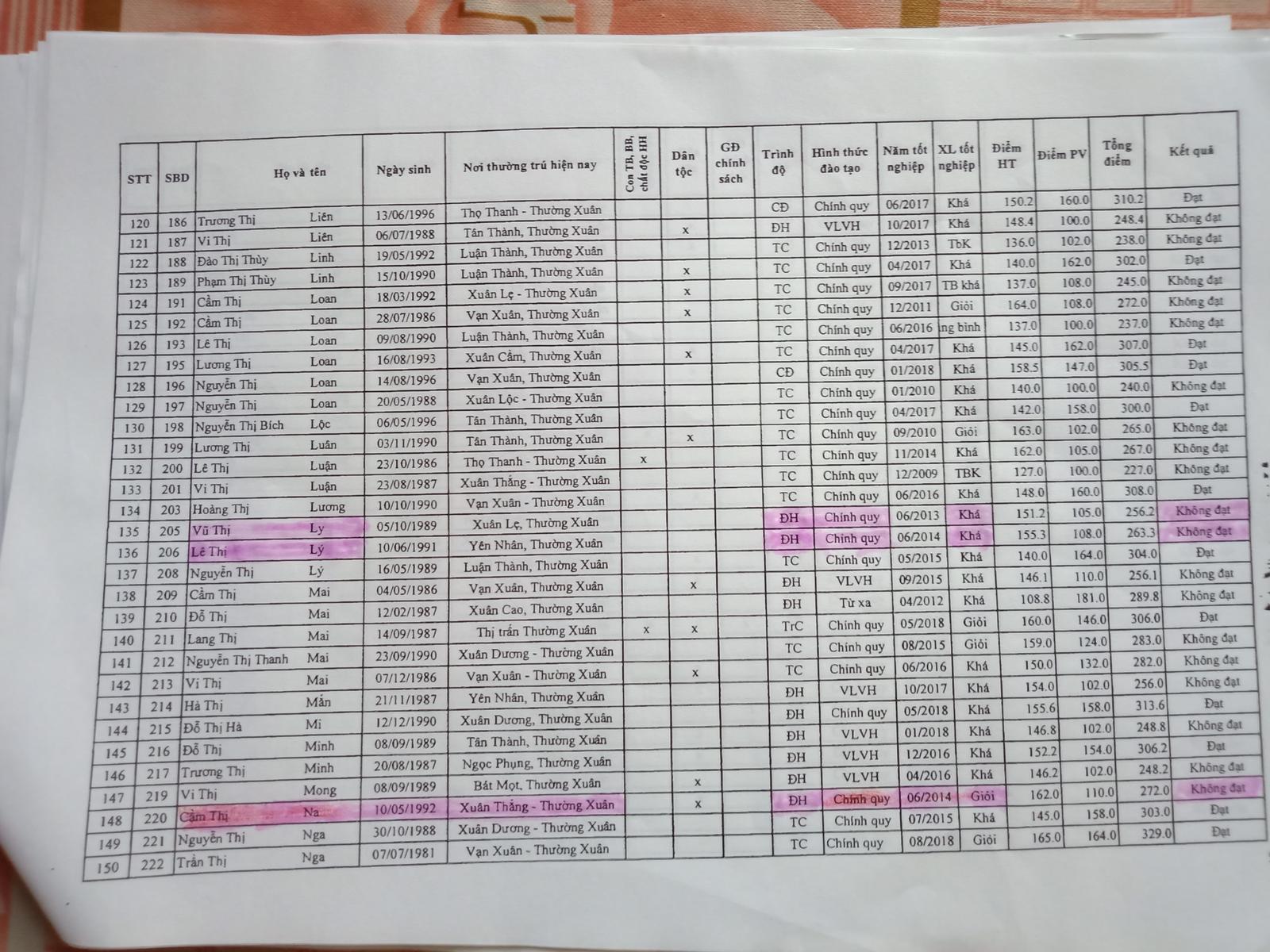 Thí sinh Lê Thùy Dương, tốt nghiệp đại học chính quy, loại giỏi, sinh ngày 12/9/1990, trú xã Thọ Thanh, huyện Thường Xuân bị đánh trượt; Trần Thị Lệ, tốt nghiệp đại học chính quy, loại giỏi, sinh ngày 23/11/1989, trú xã Xuân Dương, huyện Thường Xuân bị đánh trượt; Cầm Thị Na, tốt nghiệp đại học, loại giỏi, sinh ngày 10/5/1992, quê xã Xuân Thắng, huyện Thường Xuân bị đánh trượt; Trần Thị Ngọc, tốt nghiệp đại học chính quy, loại giỏi, sinh ngày 10/2/1997, trú thị trấn Thường Xuân, huyện Thường Xuân bị đánh trượt; Vũ Thị Thắm, tốt nghiệp đại học chính quy, loại giỏi, sinh ngày 10/2/1992, trú xã Yên Nhân, huyện Thường Xuân bị đánh trượt …