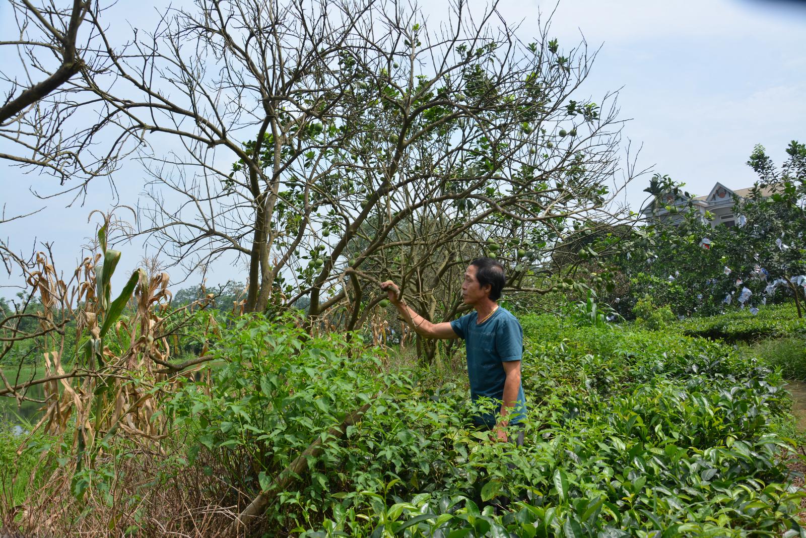 Ông Mạnh bên những cây bưởi đang độ thu hoạch bị chết khô do ngập úng. Ảnh: HB