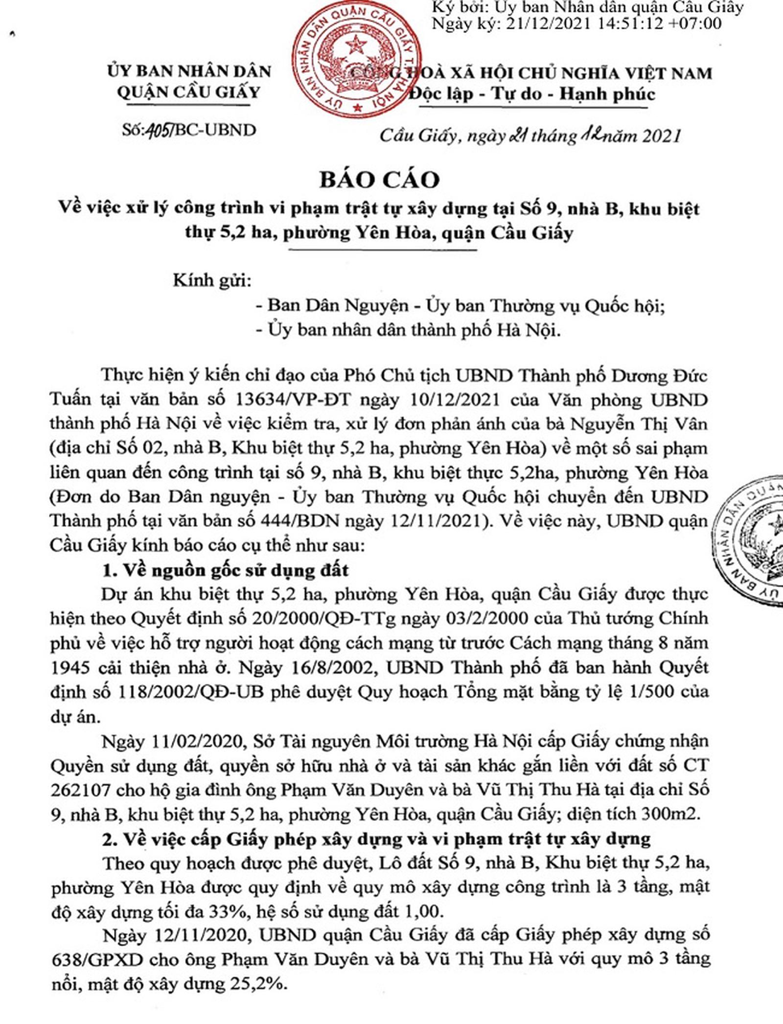 Ngày 21/12/2021, UBND quận Cầu Giấy đã có Báo cáo số 405 gửi Ban Dân nguyện, Ủy ban Thường vụ Quốc hội và UBND TP Hà Nội về việc xử lý công trình vi phạm trật tự xây dựng (TTXD) tại số 9, nhà B, khu biệt thự 5,2 ha, phường Yên Hòa, quận Cầu Giấy mà Báo Thanh tra liên tục phản ánh trong thời gian qua.