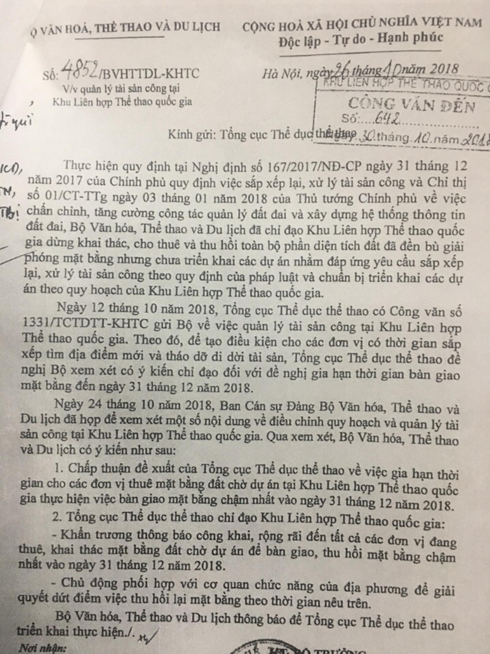 Giám đốc Cty Xây dựng và Lắp đặt Vinaco Trần Đình Hưng khẳng định: Chúng tôi được nhận các văn bản gần đây nhất của Bộ Văn hóa Thể thao và Du lịch (VHTT&DL) là Văn bản số 4852 ngày 26/10/2018 và Văn bản số 5425 của UBND TP Hà Nội đều chấp thuận gia hạn cho các đơn vị thuê mặt bằng đất chờ dự án tại Khu Liên hợp Thể thao Quốc gia Mỹ Đình thực hiện bàn giao mặt bằng chậm nhất ngày 31/12/2018.