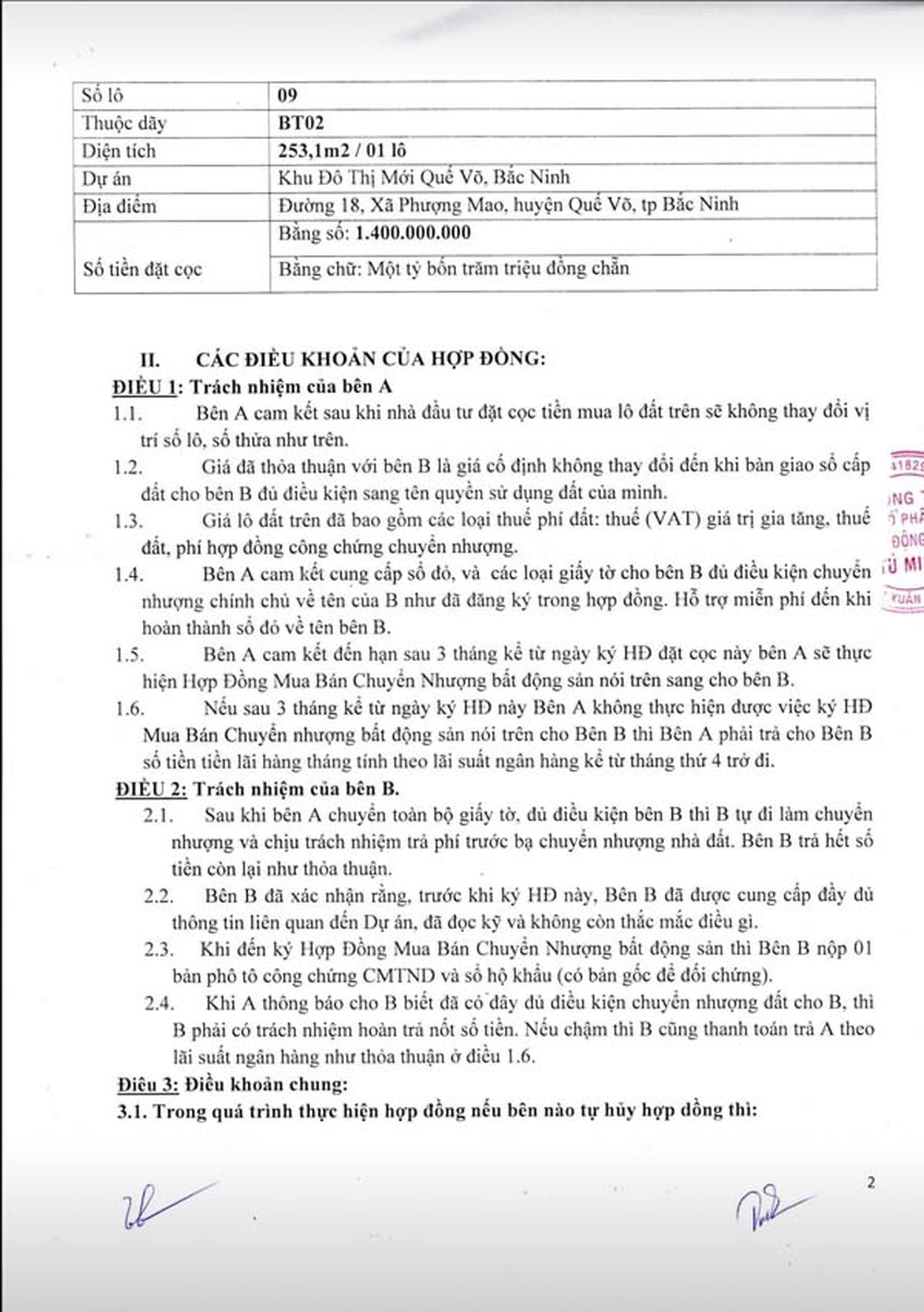 Trao đổi với chúng tôi, bà Nguyễn Thị D cho biết, ngày 28/9/2018, gia đình bà có tiến hành mua 1 lô đất biệt thự (lô 09, dãy BT02) diện tích 253,1m2 tại Khu đô thị mới Quế Võ với Cty Cổ phần Bất động sản Tú Minh (Cty Tú Minh - số 3, ngõ 125 Hoàng Ngân, Thanh Xuân, Hà Nội) với giá 8 triệu đồng/1m2.
