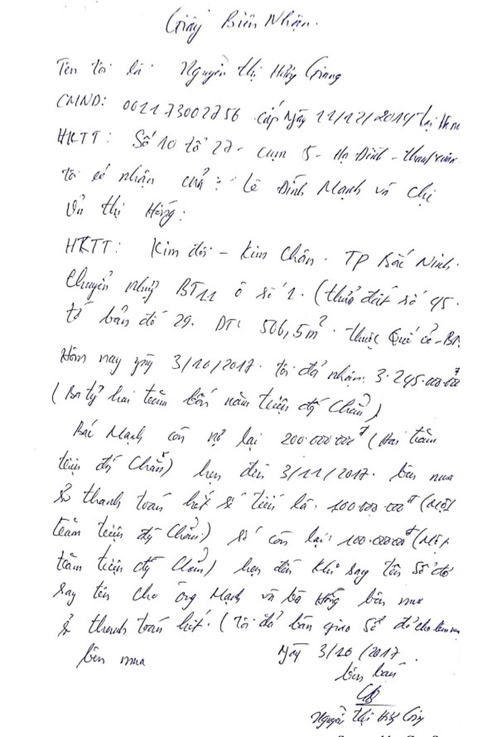 Hơn nữa, trước khi mua, gia đình có nhờ hỏi ông Nguyễn Văn Thọ, Trưởng Phòng Kinh tế Hạ tầng huyện Quế Võ và được ông Thọ cho biết, ông có quen biết với bà Giang vì bà Giang vẫn thường xuyên vào làm việc và khu đất này đã được tỉnh cấp GCNQSDĐ rồi.