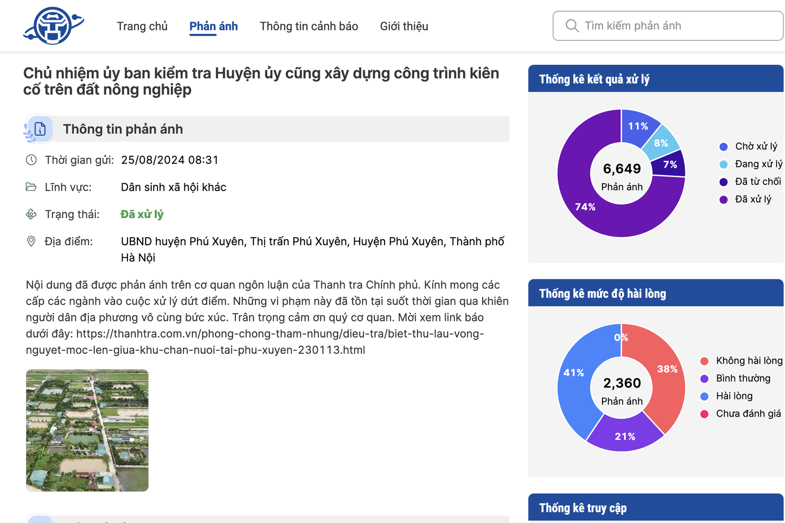 Ở diễn biến khác, tại ứng dụng công dân Thủ đô số - iHanoi là kênh tương tác số kết nối giữa chính quyền với người dân, doanh nghiệp được UBND thành phố Hà Nội đưa vào sử dụng từ tháng 6/2024, người dân phản ánh: “Chủ nhiệm Uỷ ban Kiểm tra Huyện uỷ cũng xây dựng công trình kiên cố trên đất nông nghiệp”.