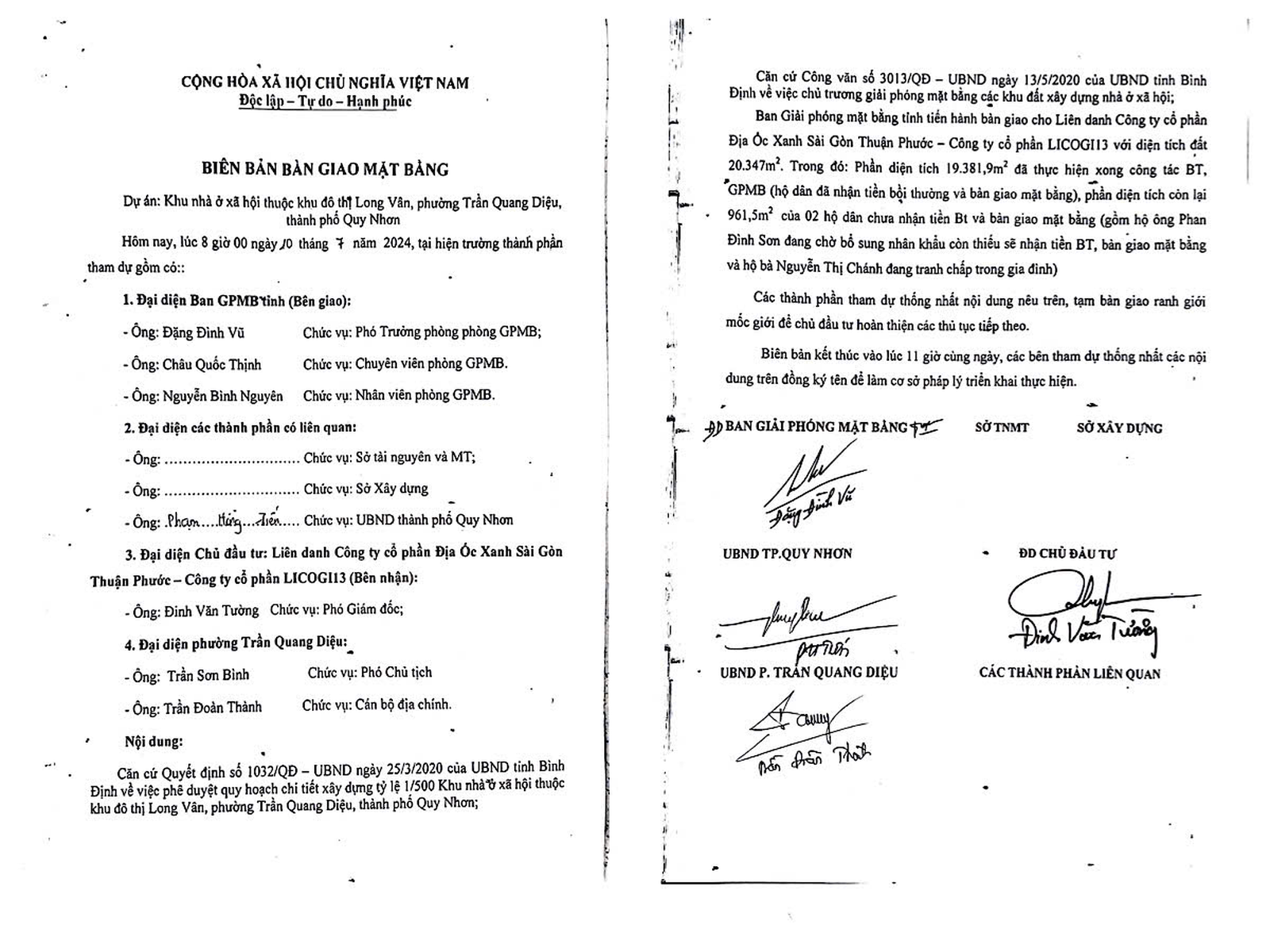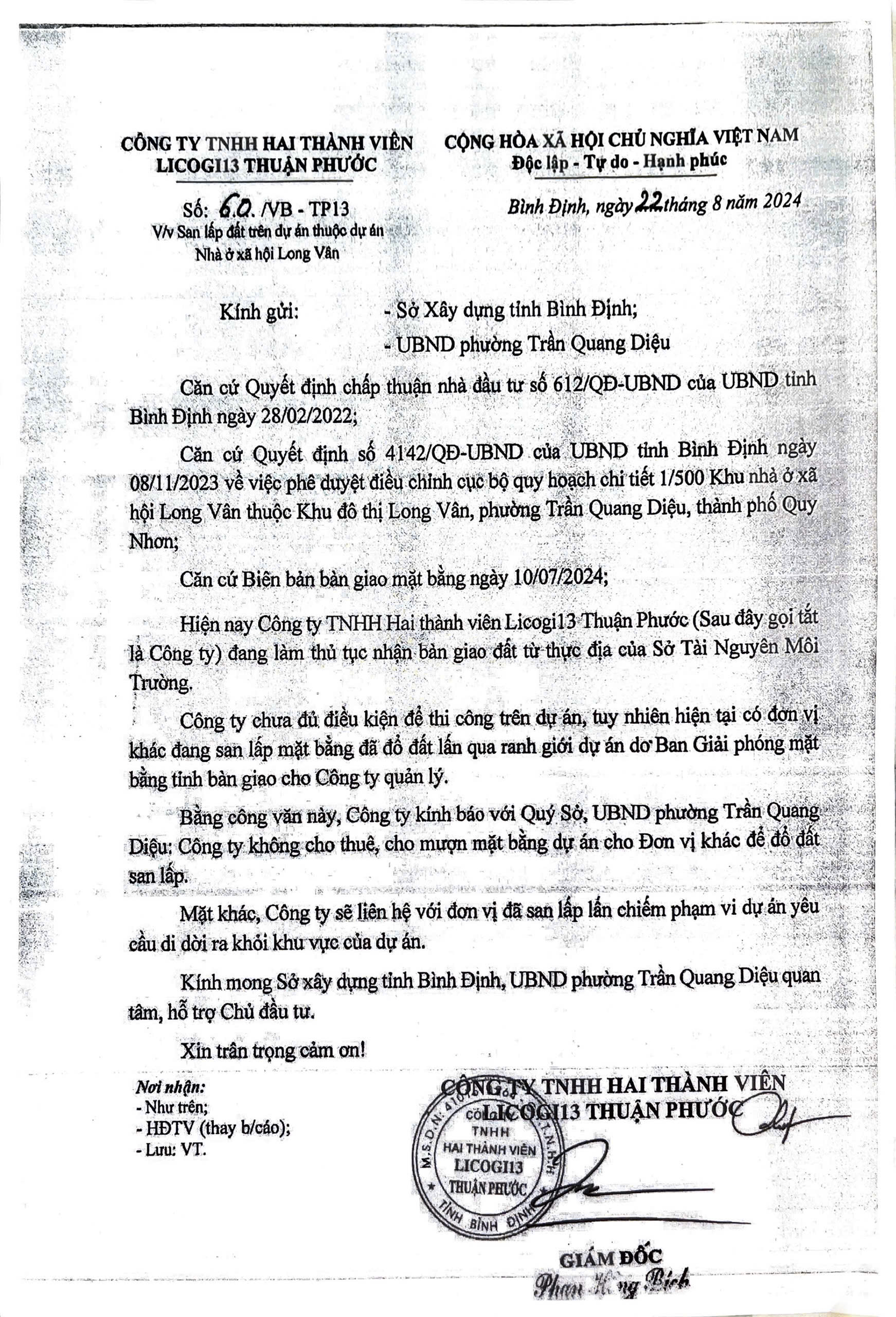 Sau khi có chỉ đạo kiểm tra, xử lý của Sở Xây dựng, ngày 22/8/2024, Công ty TNHH Hai thành viên Licogi 13 Thuận Phước (Công ty Licogi 13 Thuận Phước) đã có Văn bản số 60/VB-TP13 gửi Sở Xây dựng và UBND phường Trần Quang Diệu về việc san lấp đất trên dự án nhà ở xã hội Long Vân.