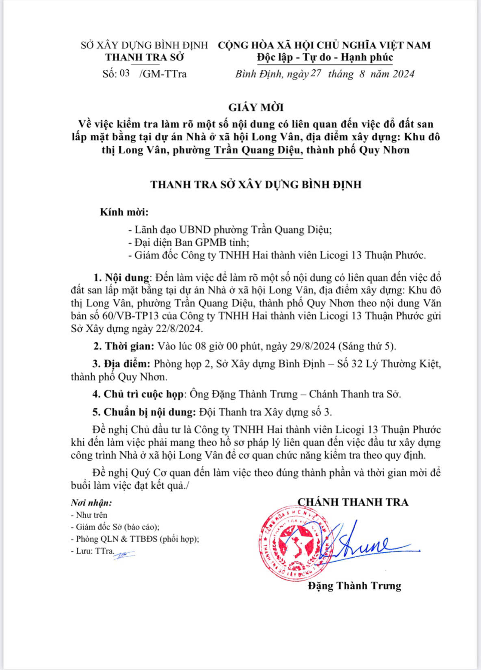 Về vấn đề trên, sáng ngày 29/8/2024, Thanh tra Sở Xây dựng Bình Định đã mời Giám đốc Công ty TNHH Hai thành viên Licogi 13 Thuận Phước đến làm việc để làm rõ một số nội dung có liên quan đến việc đổ đất san lấp mặt bằng tại dự án nhà ở xã hội Long Vân, địa điểm xây dựng khu đô thị Long Vân, phường Trần Quang Diệu, TP Quy Nhơn.