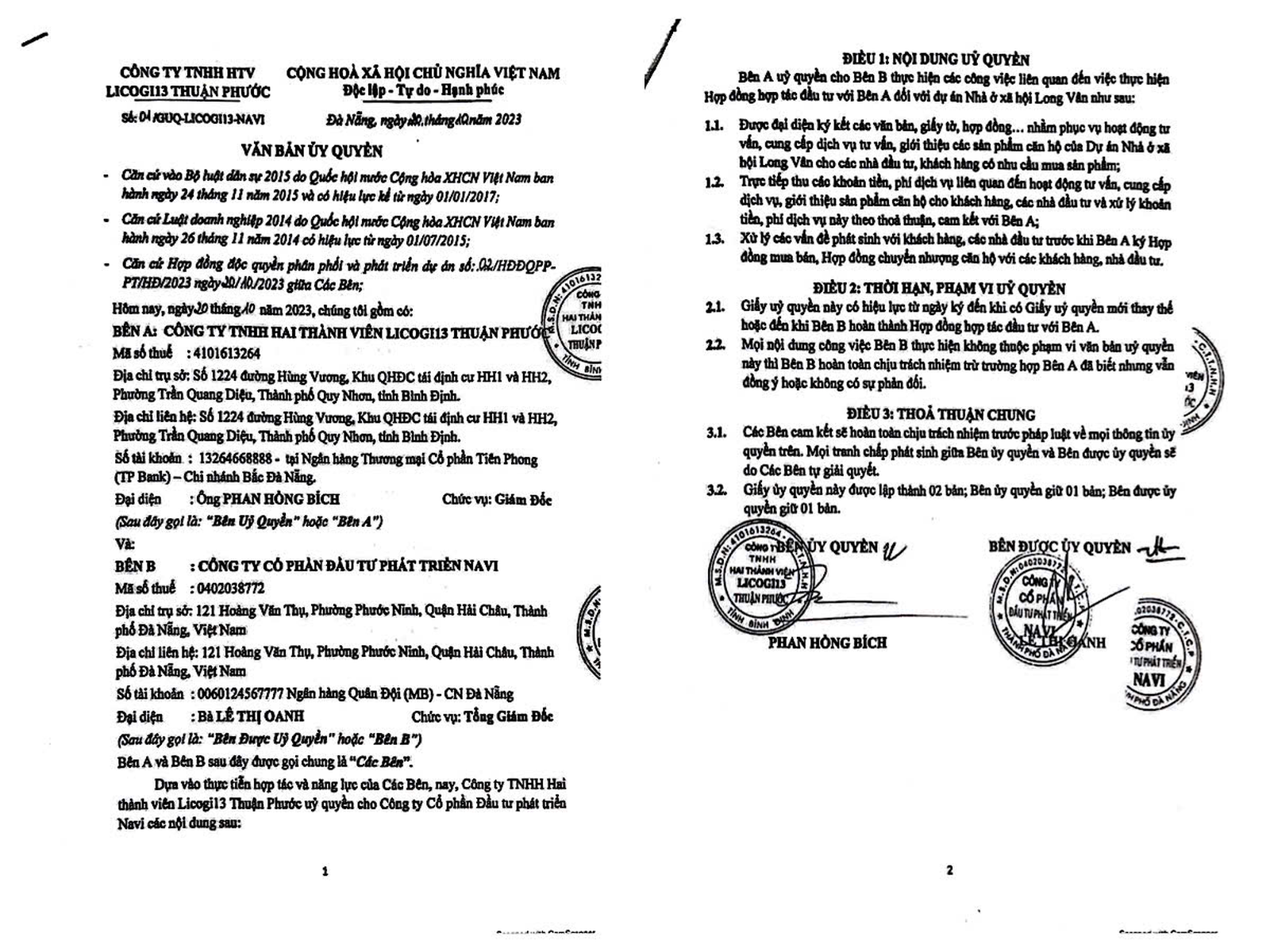 Được biết, ngày 20/10/2023, Công ty TNHH Hai thành viên Licogi 13 Thuận Phước đã có Văn bản số 01/GUQ-LICOGI13-NAVI uỷ quyền cho Công ty Cổ phần Đầu tư phát triển Navi có địa chỉ tại 121 Hoàng Văn Thụ, phường Phước Ninh, quận Hải Châu, TP Đà Nẵng về việc thực hiện hợp tác đầu tư đối với dự án nhà ở xã hội Long Vân.