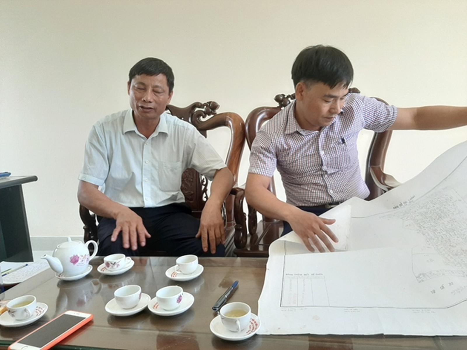 Ông Lê Chí Sơn, Phó Chủ tịch và ông Lê Văn Lượng, cán bộ địa chính làm việc với báo chí. Ảnh: CTV Phạm Ngọc