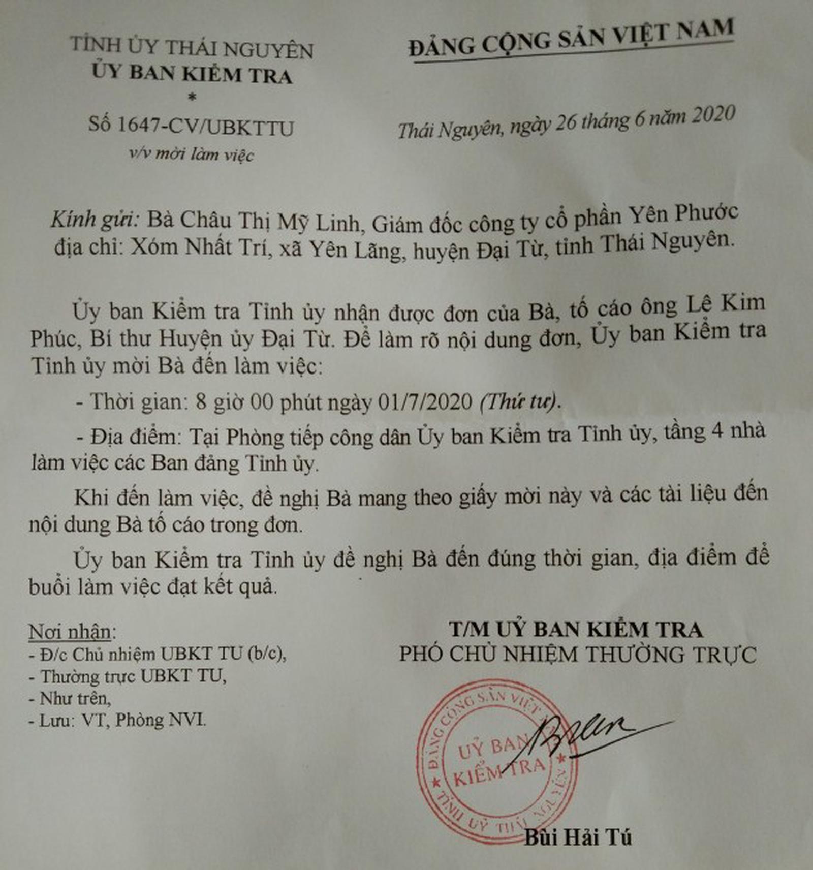 Công văn mời làm việc của Ủy ban Kiểm tra Tỉnh ủy Thái Nguyên để làm rõ nội dung đơn tố cáo. Ảnh: Chu Gia