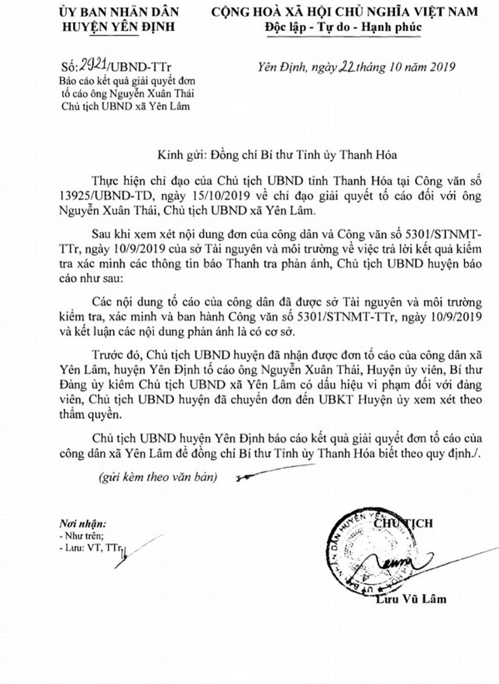 Theo đó nội dung cho biết, sau khi xem xét nội dung đơn của công dân và Công văn số 5301/STNMT-TTr ngày 10/9/2019 của Sở Tài nguyên và Môi trường (TN&MT) trả lời kết quả kiểm tra, xác minh thông tin Báo Thanh tra phản ánh, Chủ tịch UBND huyện báo cáo các nội dung tố cáo của công dân đã được Sở TN&MT kiểm tra, xác minh và khẳng định là có cơ sở. Trước đó, Chủ tịch UBND huyện cũng nhận được đơn tố cáo của công dân xã Yên Lâm tố cáo ông Nguyễn Xuân Thái, Huyện ủy viên, Bí thư Đảng ủy kiêm Chủ tịch UBND xã có dấu hiệu vi phạm đối với đảng viên, Chủ tịch UBND huyện đã chuyển đơn đến UBKT Huyện ủy xem xét theo thẩm quyền.