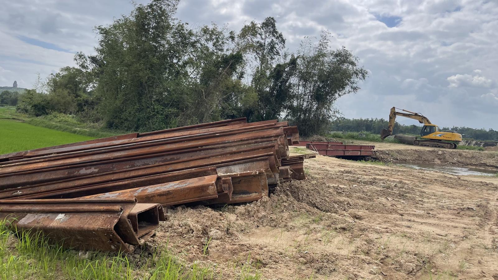 Một số vật liệu xây dựng (cừ lá sen) của Công ty TNHH Bình Yên vẫn còn để tại vị trí thi công. Ảnh: Bảo Trân
