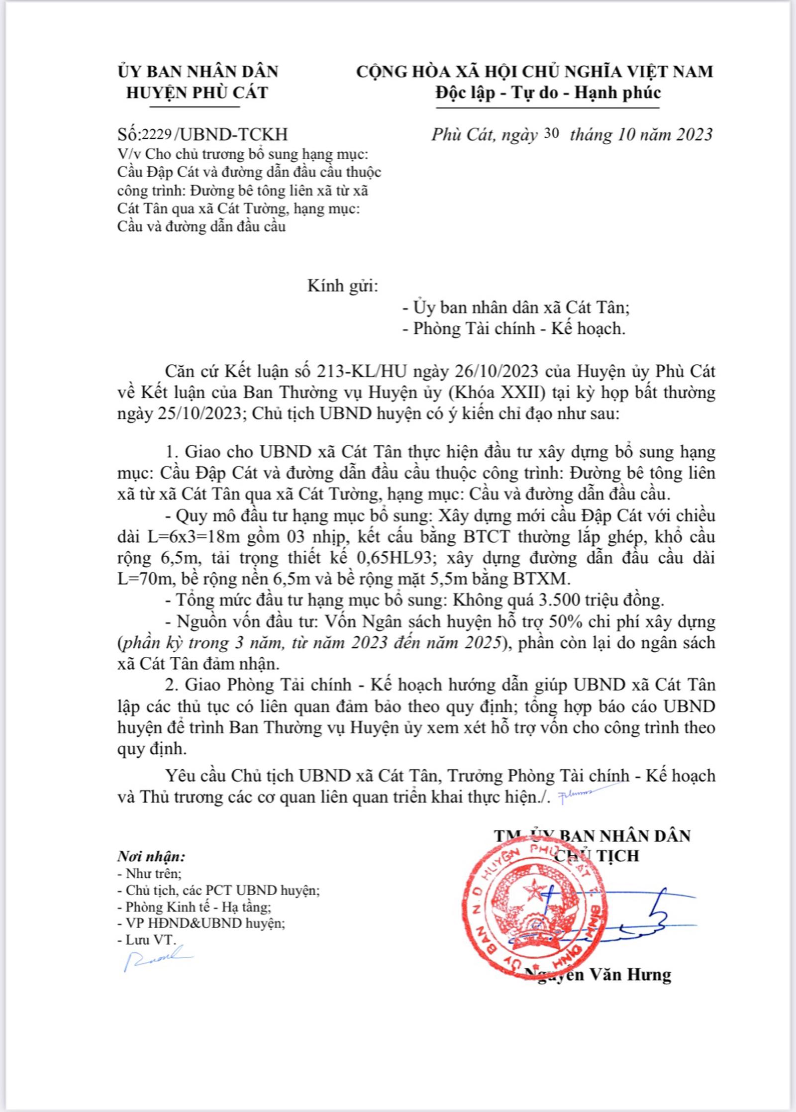 Công trình trên do UBND xã Cát Tân, huyện Phù Cát, tỉnh Bình Định làm chủ đầu tư. Tổng mức đầu tư đã phê duyệt tại Quyết định số 142/QĐ-UBND ngày 10/4/2023 của UBND xã Cát Tân là 8,47 tỷ đồng và giá trị đầu tư bổ sung là 3,49 tỷ đồng. Tổng mức đầu tư là 11,96 tỷ đồng. Nguồn vốn thực hiện hạng mục bổ sung được huyện hỗ trợ 50% chi phí xây dựng từ vốn ngân sách của huyện, phần còn lại do ngân sách xã Cát Tân đảm nhận.