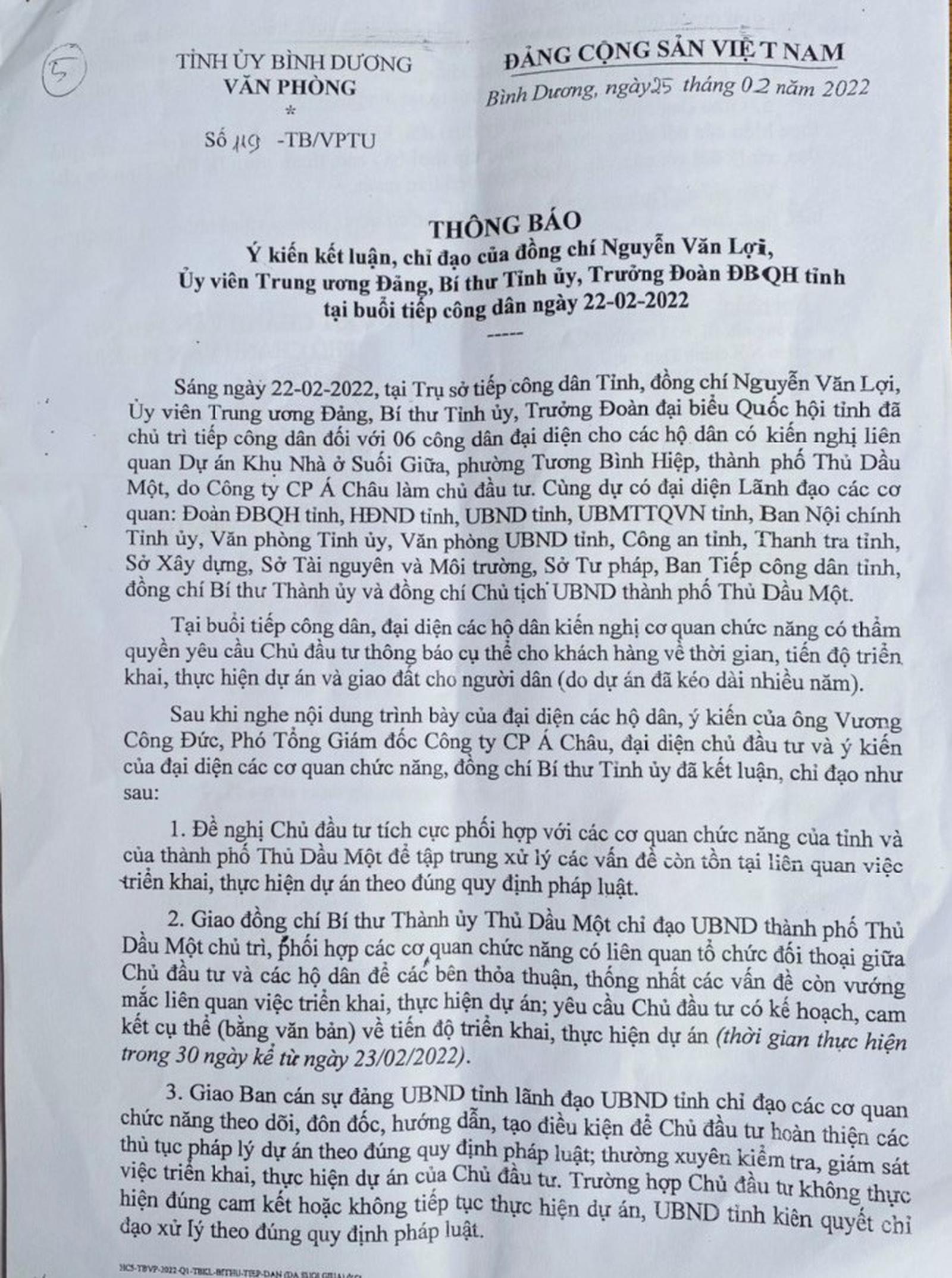 Liên quan tới đơn thư cầu cứu của hàng trăm người dân, ngày 22/2/2022, Bí thư Tỉnh ủy Bình Dương Nguyễn Văn Lợi cùng các cơ quan chức năng đã có buổi tiếp công dân cùng đại diện Cty Á Châu để xem xét, có hướng giải quyết vụ việc.