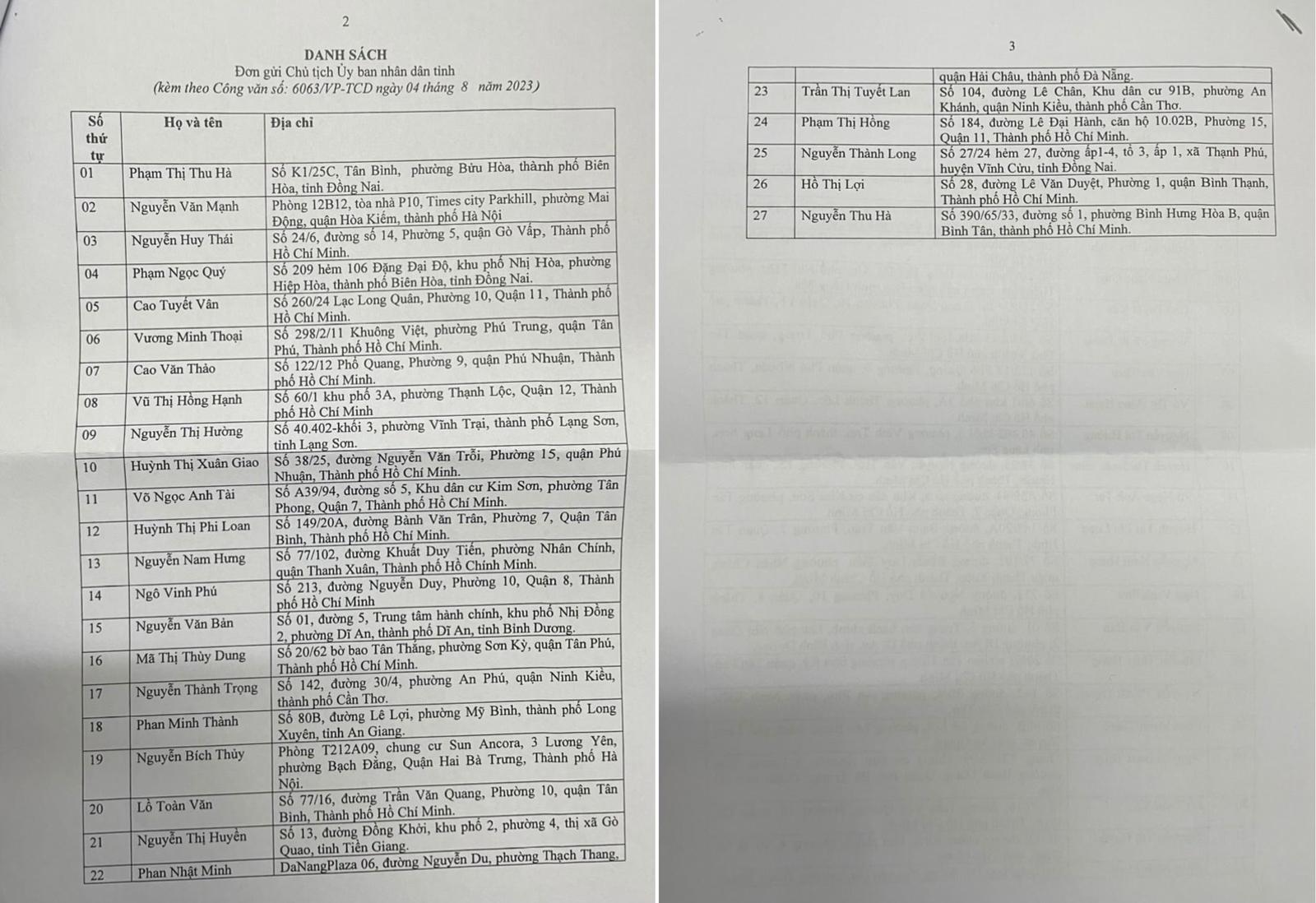 Danh sách 27 chủ đầu tư góp vốn vào dự án đã làm đơn tố cáo gửi cơ quan tố tụng. Ảnh: Chí Cường