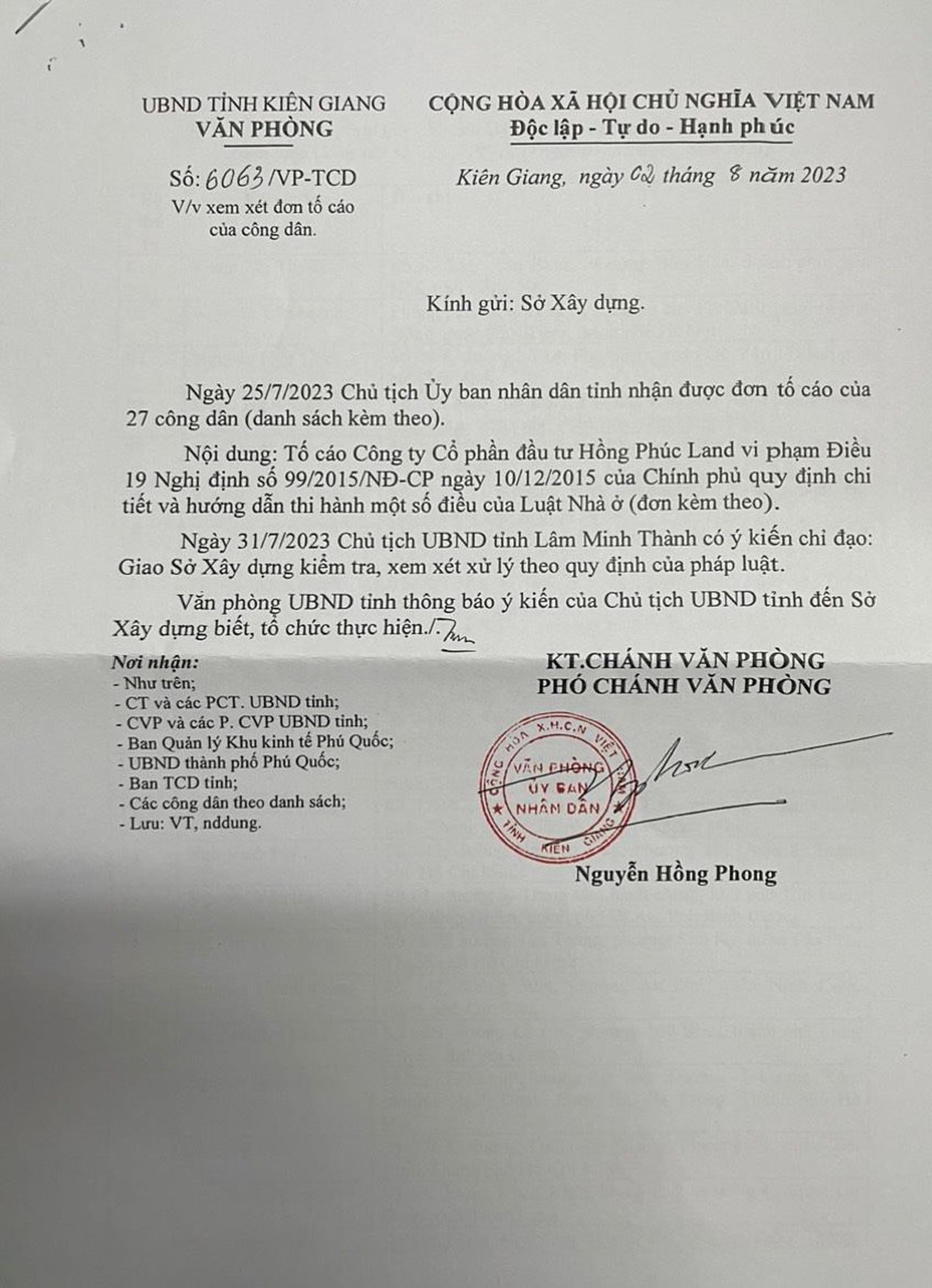Ngày 2/8/2023, Văn phòng UBND tỉnh Kiên Giang ban hành Công văn số 6063/VP- TCD về việc xem xét đơn tố cáo của công dân, gửi Sở Xây dựng đề nghị kiểm tra, xem xét và xử lý theo quy định của pháp luật.