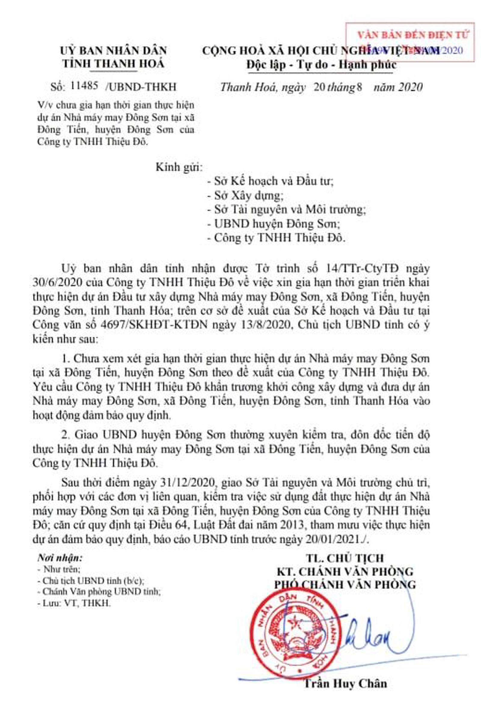 Trên cơ sở đề xuất của Sở Kế hoạch và Đầu tư tại Công văn số 4697, Chủ tịch UBND tỉnh Thanh Hóa có ý kiến chưa xem xét gia hạn thời gian thực hiện dự án Nhà máy May Đông Sơn theo đề xuất của Công ty TNHH Thiệu Đô. Theo đó, yêu cầu Công ty TNHH Thiệu Đô khẩn trương khởi công xây dựng và đưa dự án vào hoạt động đảm bảo quy định. Giao cho UBND huyện thường xuyên kiểm tra, đôn đốc. Sau tho điểm ngày 31/12/2020, giao Sở Tài nguyên và Môi trường chủ trì, phối hợp với các đơn vị liên quan, kiểm tra việc sử dụng đất thực hiện dự án. Căn cứ tại Điều 64 Luật Đất đai 2013, tham mưu thực hiện dự án đảm bảo quy định, báo cáo UBND tỉnh trước ngày 20/1/2021".
