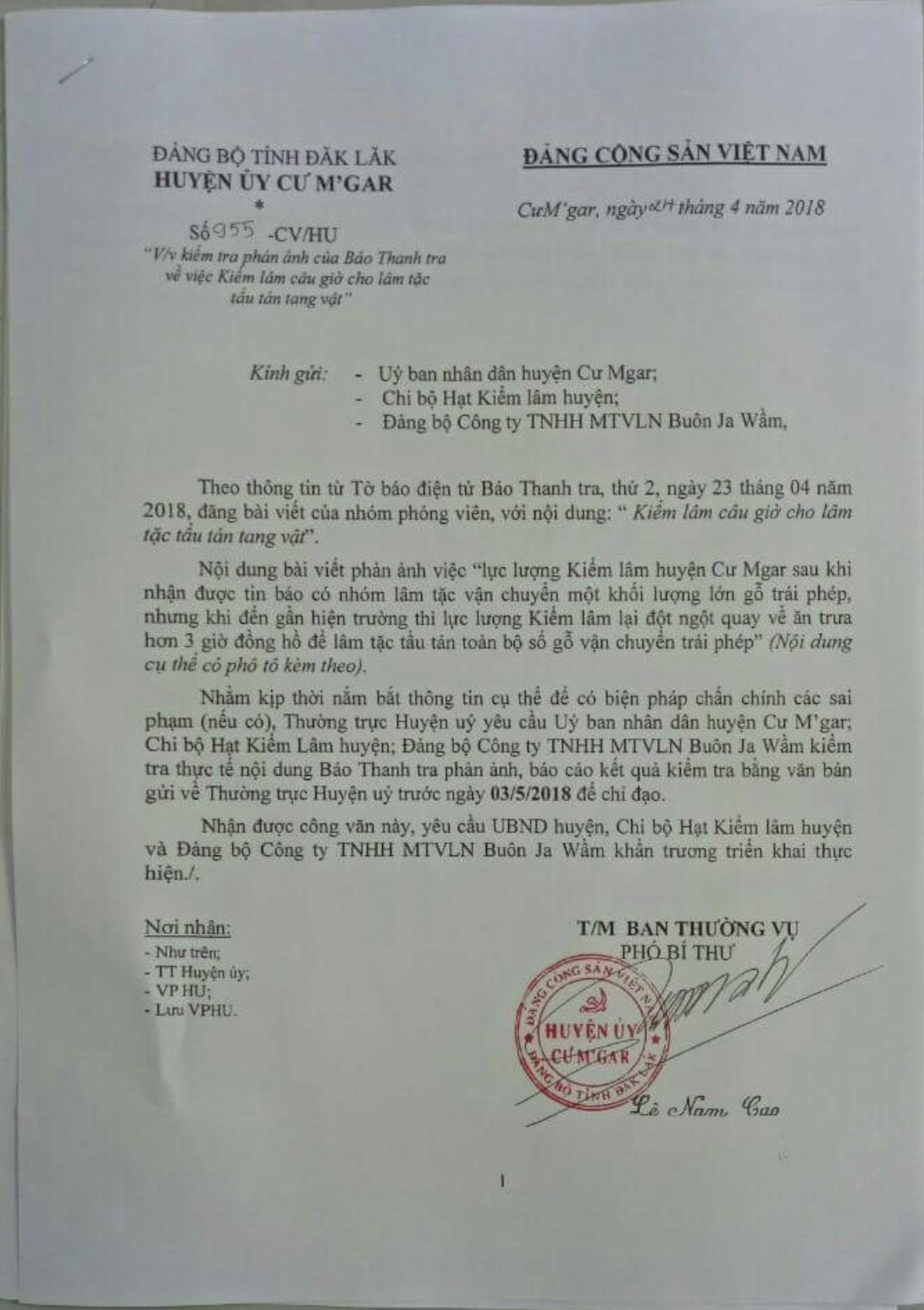 Ngày 24/4, Huyện ủy CưM’gar ban hành Công văn số 955-CV/HU gửi UBND huyện CưM’gar, Chi bộ Hạt Kiểm lâm huyện và Đảng bộ Công ty TNHH MTV Lâm nghiệp Buôn Ja Wầm, nêu rõ: “Nhằm kịp thời nắm bắt thông tin cụ thể để có biện pháp chấn chỉnh các sai phạm (nếu có), Thường trực Huyện ủy yêu cầu UBND huyện CưM’gar, Chi bộ Hạt Kiểm lâm huyện; Đảng bộ Công ty TNHH MTV Lâm nghiệp Buôn Ja Wầm kiểm tra thực tế nội dung Báo Thanh tra phản ánh, báo cáo kết quả kiểm tra bằng văn bản gửi về Thường trực Huyện ủy trước ngày 3/5/2018 để chỉ đạo”.