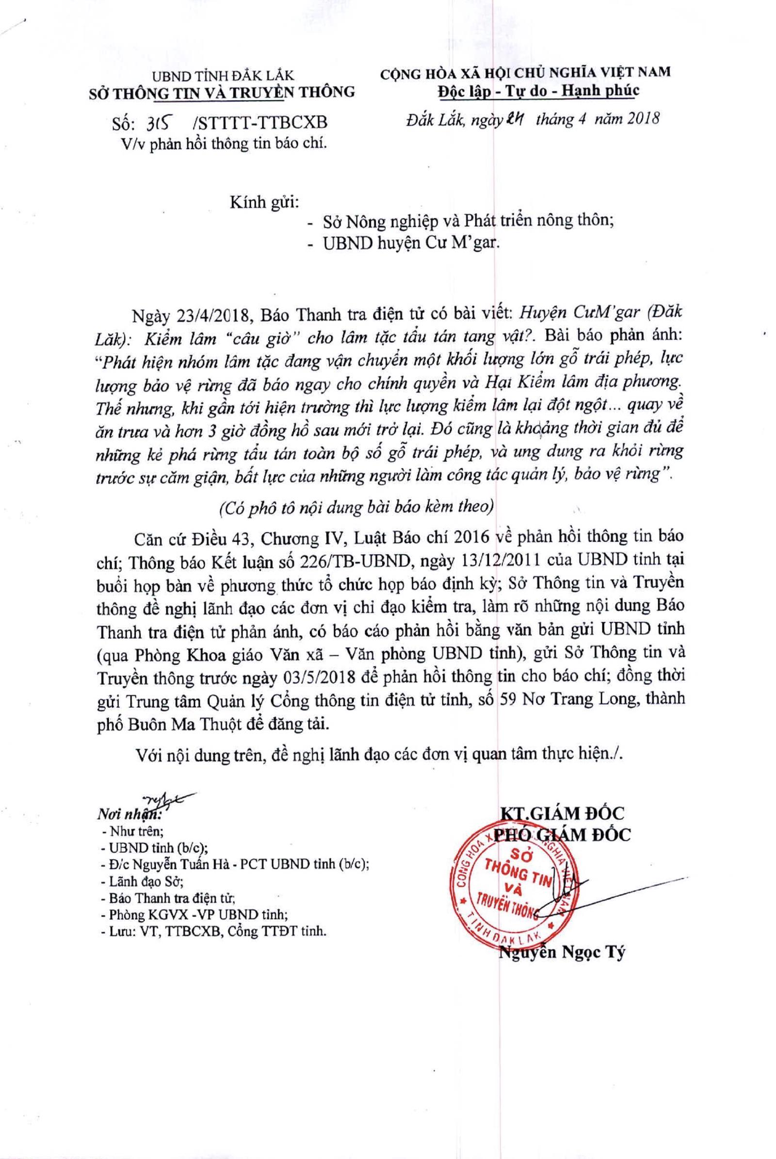 Ngày 24/4, Sở Thông tin và Truyền thông tỉnh Đắk Lắk cũng đã ban hành Văn bản số 315 gửi Sở Nông nghiệp và Phát triển nông thôn, UBND huyện CưM’gar đề nghị lãnh đạo các đơn vị liên quan chỉ đạo kiểm tra, làm rõ những nội dung Báo Thanh tra điện tử phản ánh, đồng thời có báo cáo phản hồi bằng văn bản gửi UBND tỉnh và Sở Thông tin và Truyền thông trước ngày 3/5/2018 để phản hồi thông tin cho báo chí.