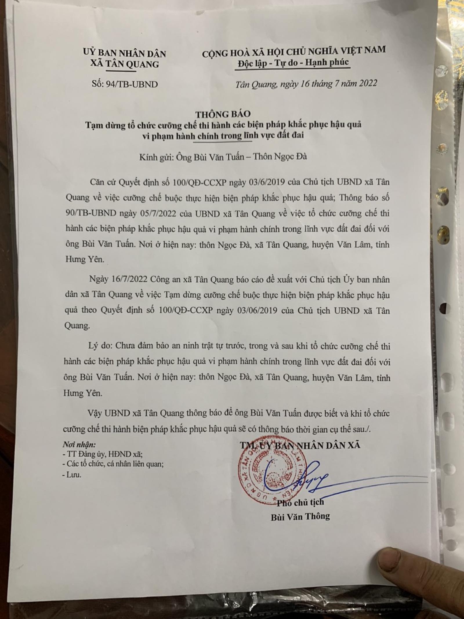 Điều đáng nói là, chỉ sau đó ít ngày, Phó Chủ tịch UBND xã Tân Quang Bùi Văn Thông lại ký thông báo tạm dừng tổ chức cưỡng chế thi hành các biện pháp khắc phục hậu quả vi phạm hành chính trong lĩnh vực đất đai. Lý do tạm dựng là chưa đảm bảo an ninh trật tự trước, trong và sau khi tổ chức cưỡng chế thi hành các biện pháp khắc phục hậu quả vi phạm hành chính trong lĩnh vực đất đai.