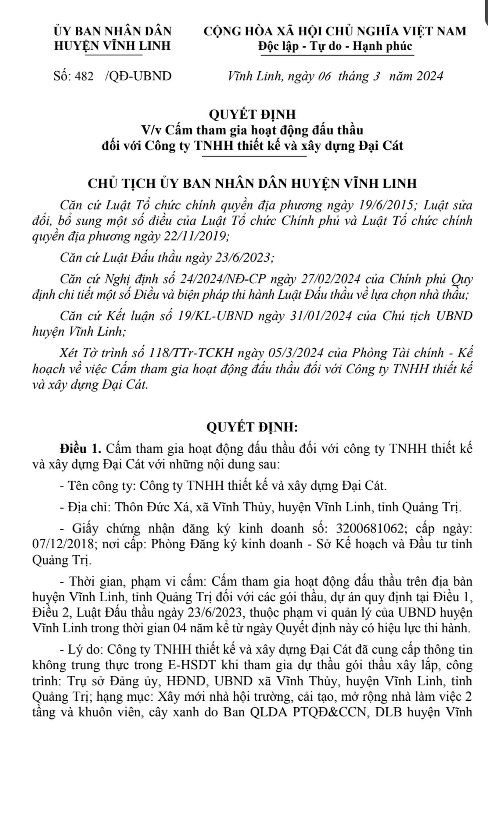 Ngày 6/3, ông Thái Văn Thành, Chủ tịch UBND huyện Vĩnh Linh đã ký ban hành Quyết định số 482/QĐ-UBND về việc cấm tham gia hoạt động đấu thầu đối với Cty Đại Cát.