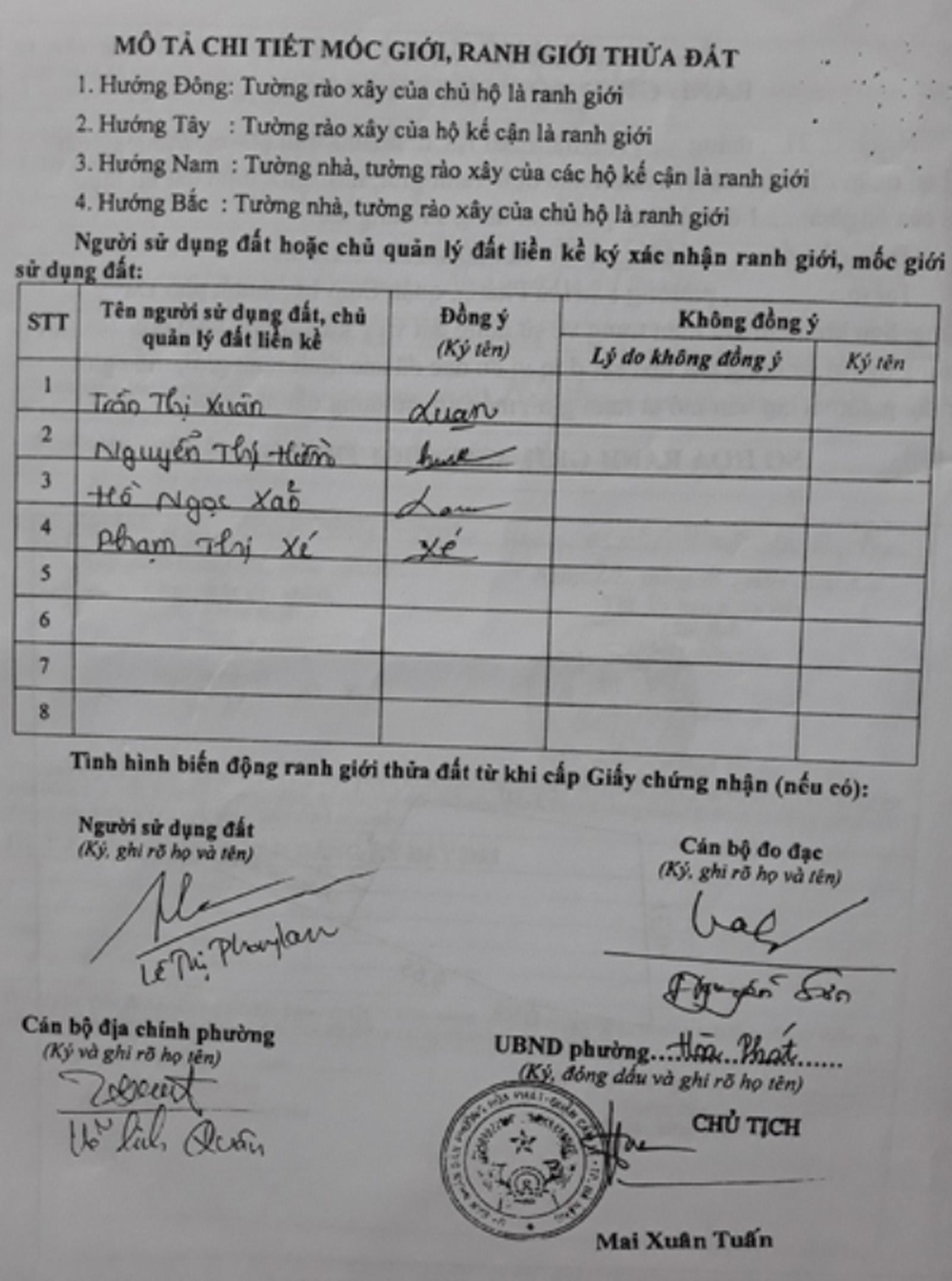 Lô đất 100m2 nói trên khi chuyển nhượng đến tay bà Lê Thị Phong Lan thì diện tích thửa đất bất ngờ tăng lên 134m2. Đặc biệt là, trong hồ sơ đăng ký sổ đỏ các hộ liền kề và gia đình ông Chinh không hề ký tứ cận nhưng bà Lan vẫn có được chữ ký để được cấp sổ đỏ.