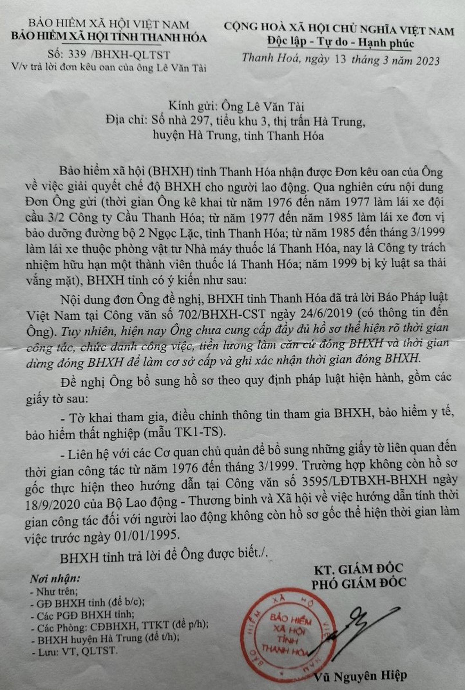 Ngày 13/3/2023, BHXH tỉnh Thanh Hóa có Văn bản số 339/BHXH-QLTST, yêu cầu ông Tài liên hệ với các cơ quan chủ quản để bổ sung những giấy tờ liên quan đến thời gian công tác từ năm 1976 đến tháng 3/1999. Trường hợp không còn hồ sơ gốc, thực hiện theo hướng dẫn tại Công văn số 3595/LĐTBXH-BHXH ngày 18/9/2020 của Bộ Lao động - Thương binh và Xã hội về việc hướng dẫn tính thời gian công tác đối với người lao động không còn hồ sơ gốc thể hiện thời gian làm việc trước ngày 1/1/1995.