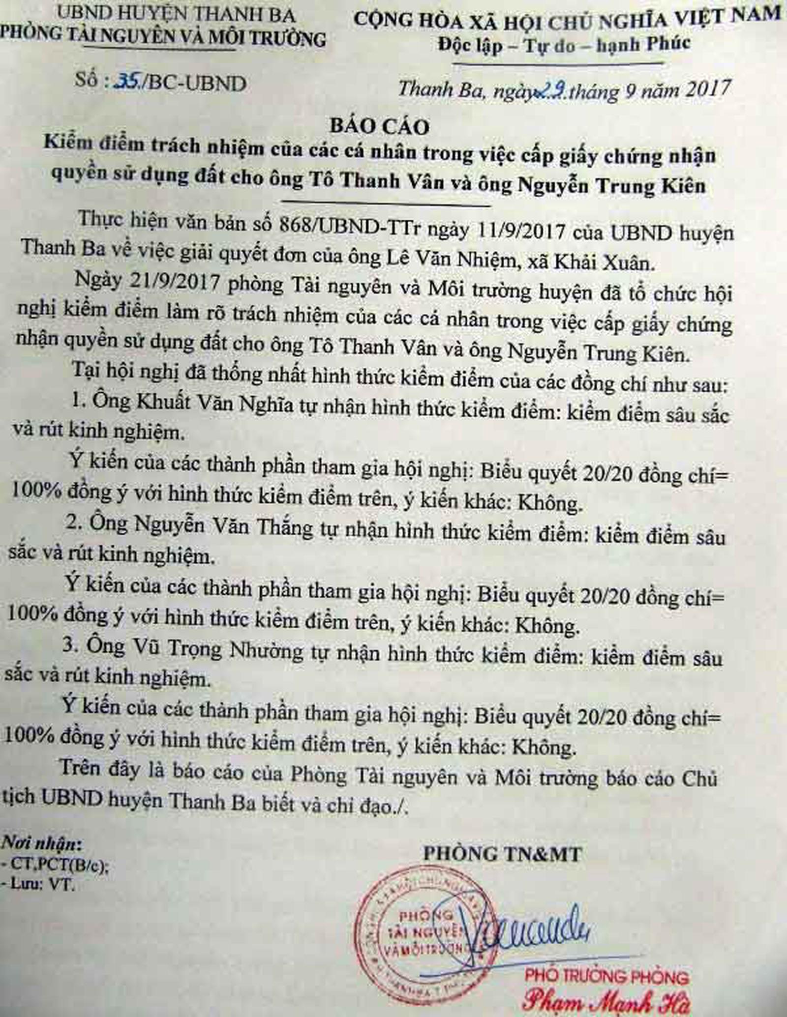 Báo cáo số 35/BC-UBND ngày 29/9/2017 của Phòng TN&MT huyện Thanh Ba về Kiểm điểm trách nhiệm của các cá nhân trong việc cấp GCNQSDĐ cho ông Tô Thanh Vân và ông Nguyễn Trung Kiên cho thấy, các cán bộ thuộc diện kiểm điểm đều tự nhận: Kiểm điểm sâu sắc và rút kinh nghiệm!