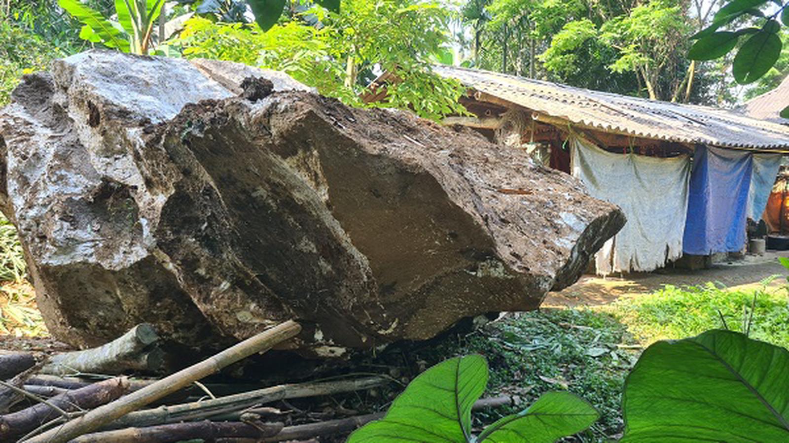 Khối đá có kích thước lớn lăn vào vườn nhà dân. Ảnh: Bùi Bình