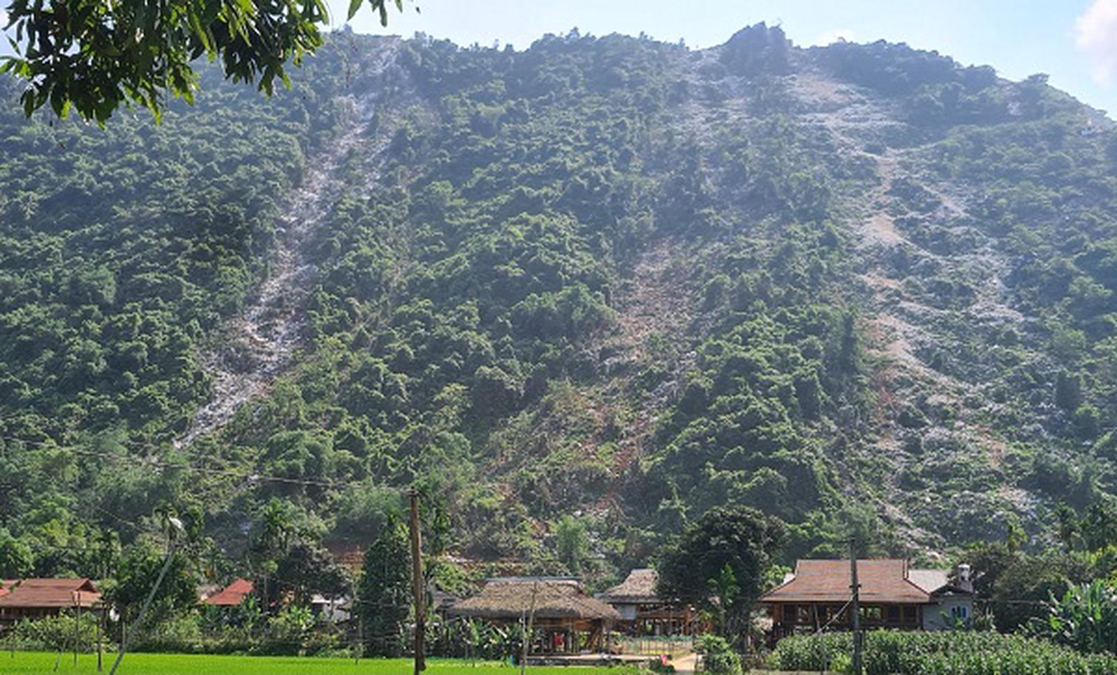 Theo quan sát của PV, khoảng cách từ các hộ dân tới chân núi khoảng hơn 100m, vách núi cao khoảng gần 300m có độ dốc lớn, khi xử lý, những khối đá có kích thước lớn lăn xuống cuốn theo những khối đá khác và cây cối trên đường đi tạo thành những vết trượt nhìn rất đáng sợ.
