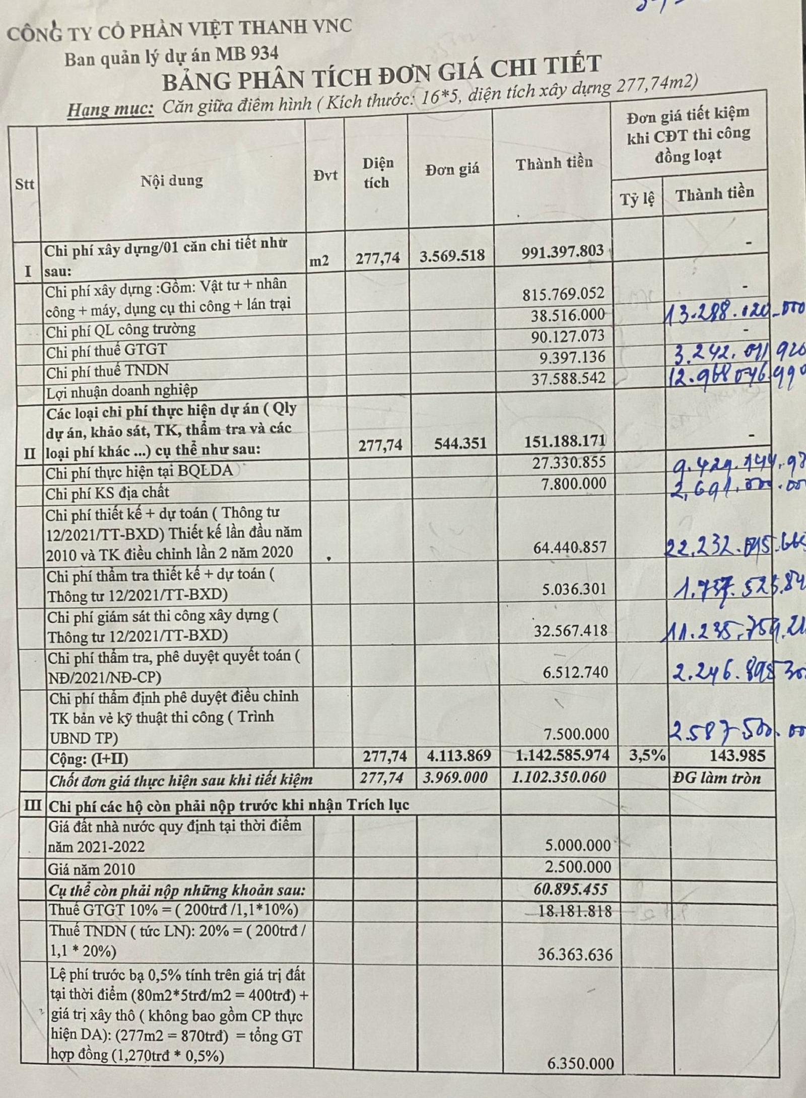 Nếu theo bản phân tích đơn giá chi tiết do Ban Quản lý dự án MBQH 934 Công ty Cổ phần VNC Việt Thanh đưa ra thì chi phí xây dựng một căn nhà thô có rất nhiều loại thu. Cụ thể, chi phí xây dựng gồm vật tư, nhân công, máy, dụng cụ thi công, lán trại, quản lý công trường, thuế giá trị gia tăng, thuế thu nhập doanh nghiệp, lợi nhuận doanh nghiệp; các loại chi phí thực hiện dự án như quản lý dự án, khảo sát địa chất, thiết kế, dự toán lần đầu năm 2010, thiết kế điều chỉnh lần 2 năm 2020, chi phí thẩm tra thiết kế cộng dự toán theo Thông tư 12/2021/TT-BXD; chi phí giám sát thi công xây dựng; chi phí thẩm tra, phê duyệt quyết toán; chi phí thẩm định phê duyệt điều chỉnh thiết kế bản vẻ kỹ thuật thi công trình UBND TP Thanh Hóa với giá đưa ra cao ngất ngưởng.