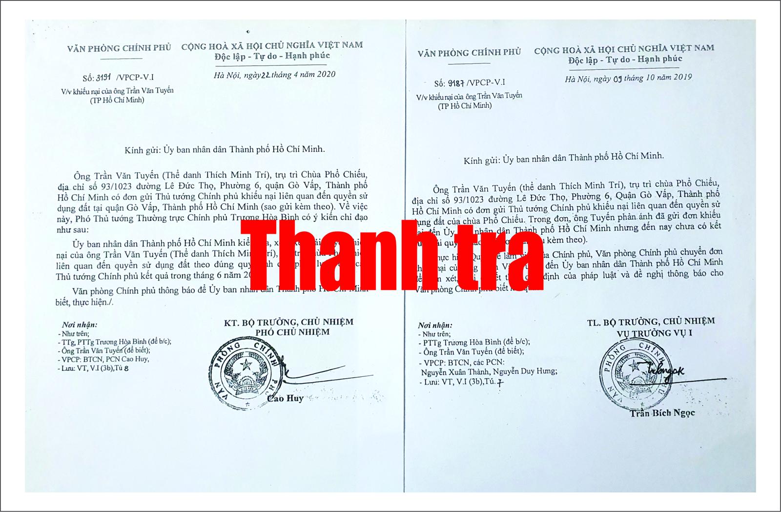 Ngày 9/10/2019, Văn phòng Chính phủ ban hành Văn bản số 9187/VPCP-V.I; Văn bản số 3191/VPCP-V.I ngày 22/4/2020 gửi UBND TP Hồ Chí Minh thông báo về việc khiếu nại liên quan đến quyền sử dụng đất của chùa, yêu cầu kiểm tra, xem xét giải quyết theo quy định.