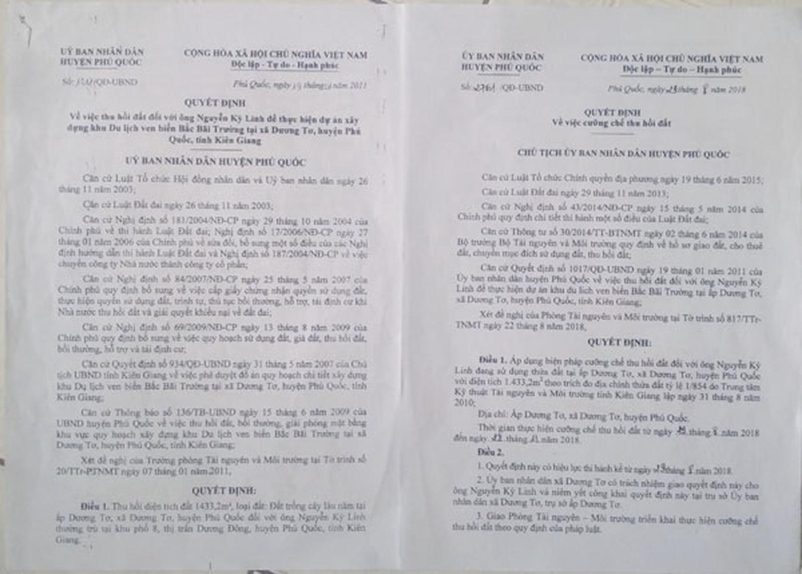 Đến năm 2011, UBND huyện Phú Quốc đã ban hành các quyết định thu hồi đất đối với các hộ dân, trong đó gia đình ông Nguyễn Kỳ Linh bị thu hồi hơn 1.433m2; loại đất trồng cây lâu năm.
