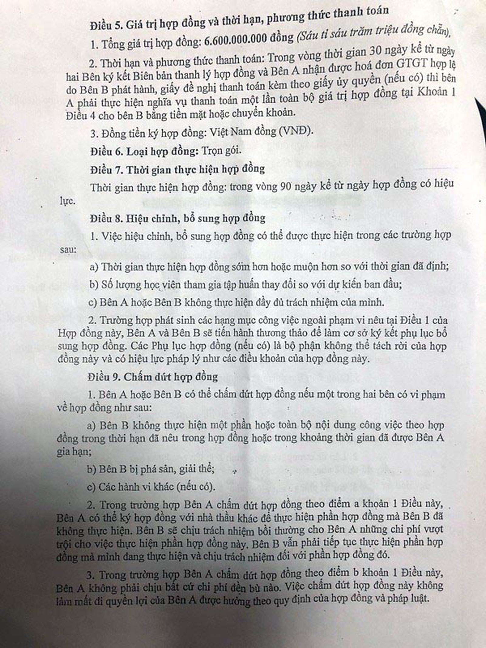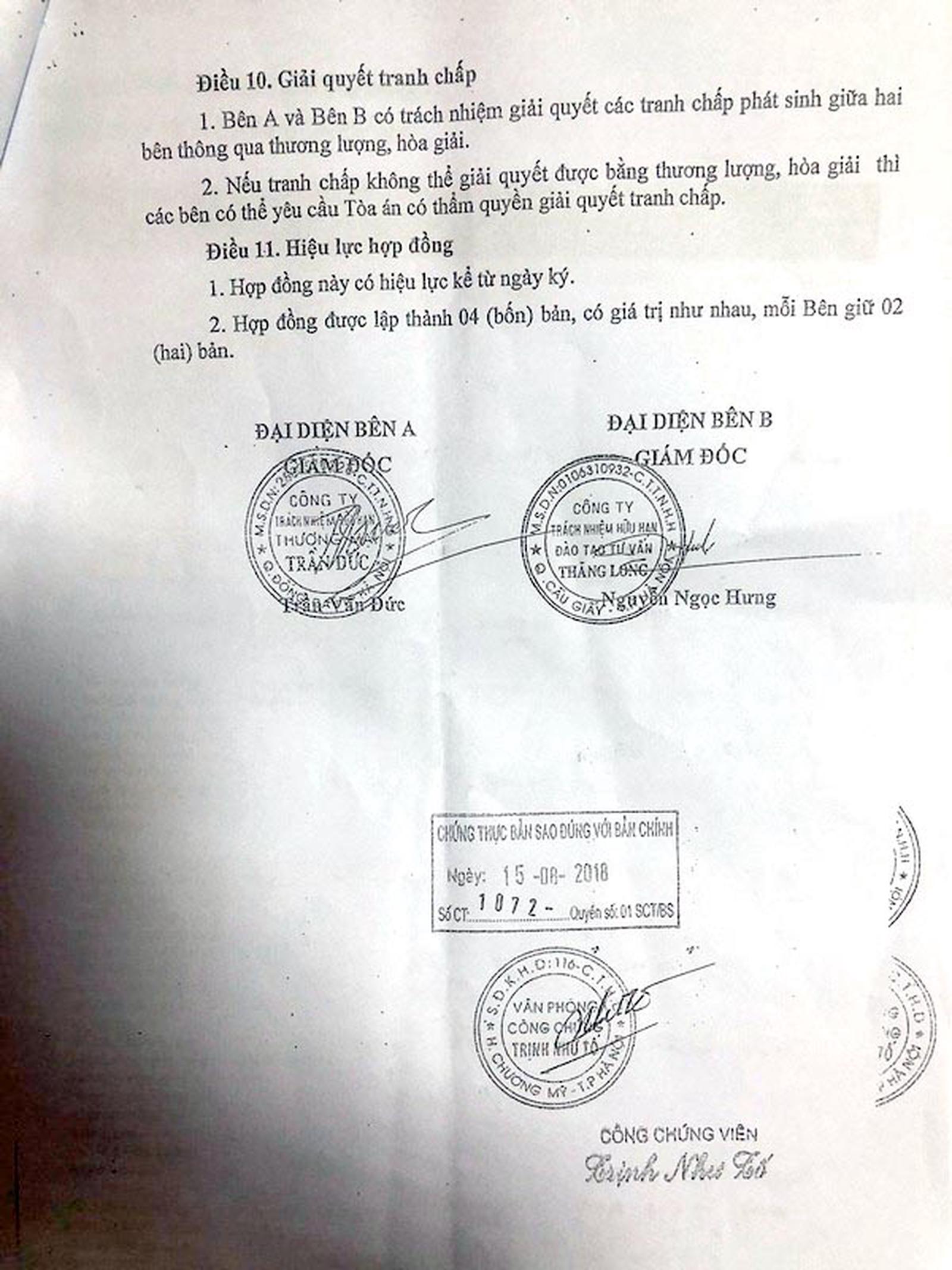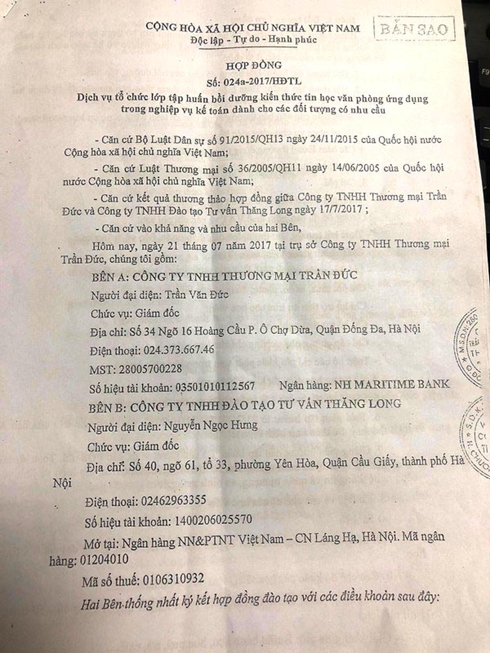 Hợp đồng số 024a-2017/HĐTL được ký giữa nhà thầu là Công ty TNHH Đào tạo tư vấn Thăng Long và chủ đầu tư là Công ty TNHH Thương mại Trần Đức, có giá trị lên tới 6,6 tỷ đồng.