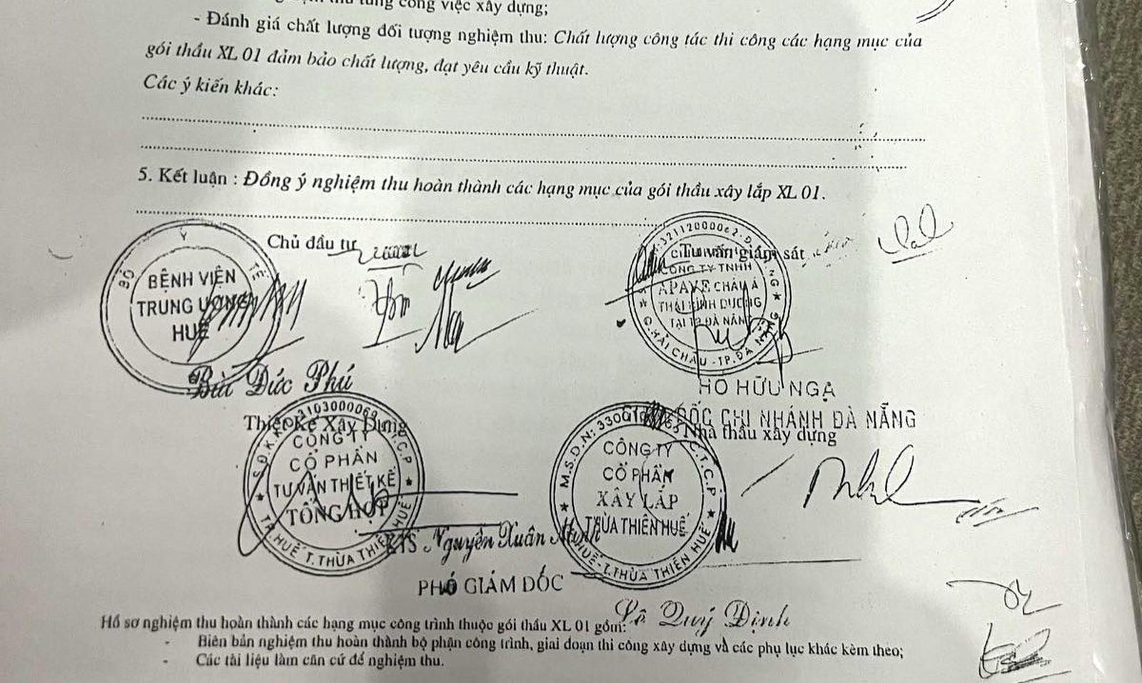 "Liên danh trên đã thực hiện hoàn thành Gói thầu XL01 theo đúng hợp đồng và ngày 4/9/2013 đã được chủ đầu tư, tư vấn giám sát, tư vấn thiết kế cùng nhà thầu tiến hành nghiệm thu hoàn thành hạng mục công trình xây dựng để đưa vào sử dụng theo quy định", công văn của Bệnh viện Trung ương Huế khẳng định.
